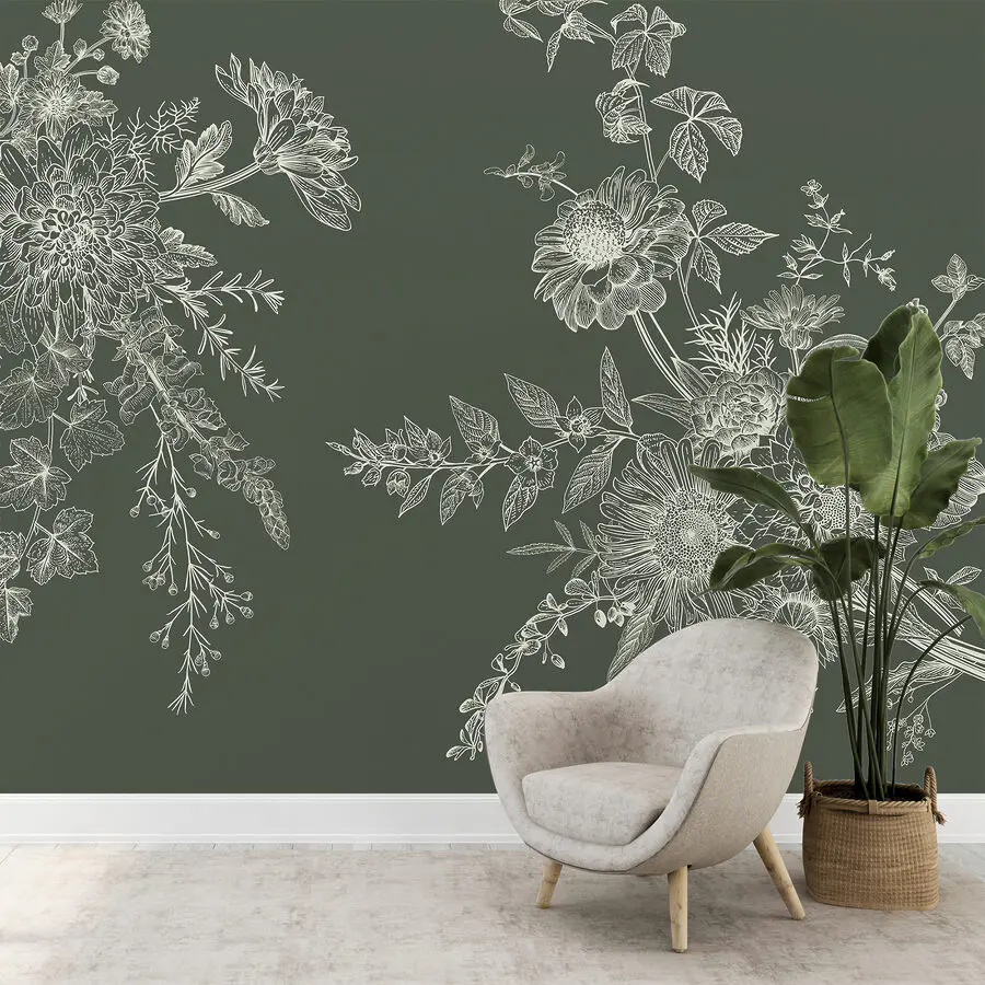 Transform a dull wall into a blooming masterpiece with this elegant floral mural. Set against a deep, dark backdrop, the intricate white sketches of flowers and foliage pop with life, adding a touch of nature’s charm to any room. Imagine sipping coffee in a cozy corner, surrounded by these lovely blooms that seem to dance off the walls. It’s like bringing a secret garden indoors, where every glance offers a little joy. Perfect for those moments when you need a daydream escape or just want to impress friends with your unique style. Who knew decorating could feel this vibrant?