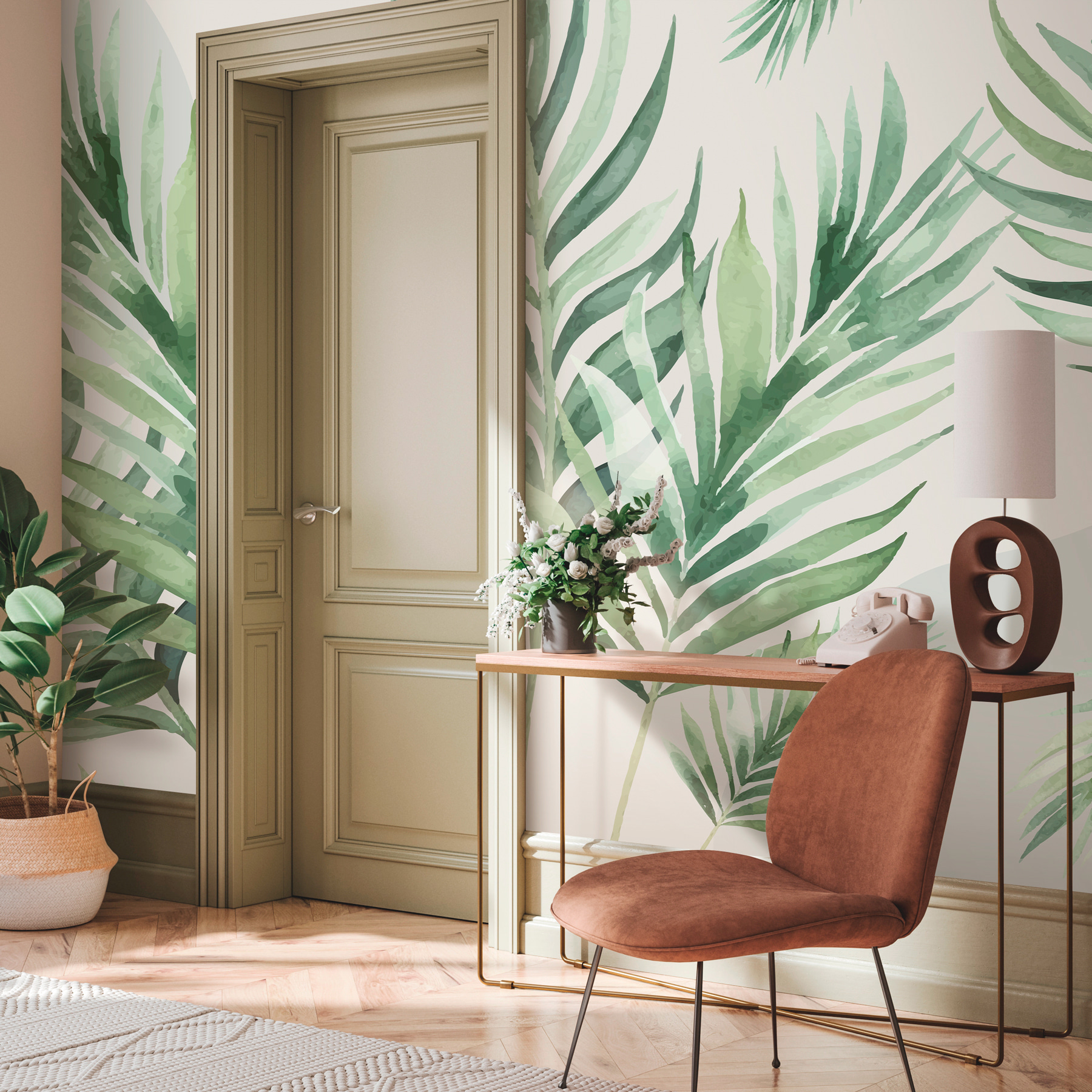 Transform a blank wall into a tropical escape with this mural of soft watercolor leaves. It’s like bringing a bit of the jungle right into your living room—no bugs or wild animals included. The gentle greens dance across the surface, evoking a calm breeze and the sound of rustling foliage, perfect for daydreaming during your coffee break. Imagine sipping tea surrounded by these lush hues, feeling a little less like a city dweller and a bit more like you’re kicking back in a serene beach cabana. It’s not just decor; it’s an invitation to unwind! Perfect for any space looking to add a touch of nature.