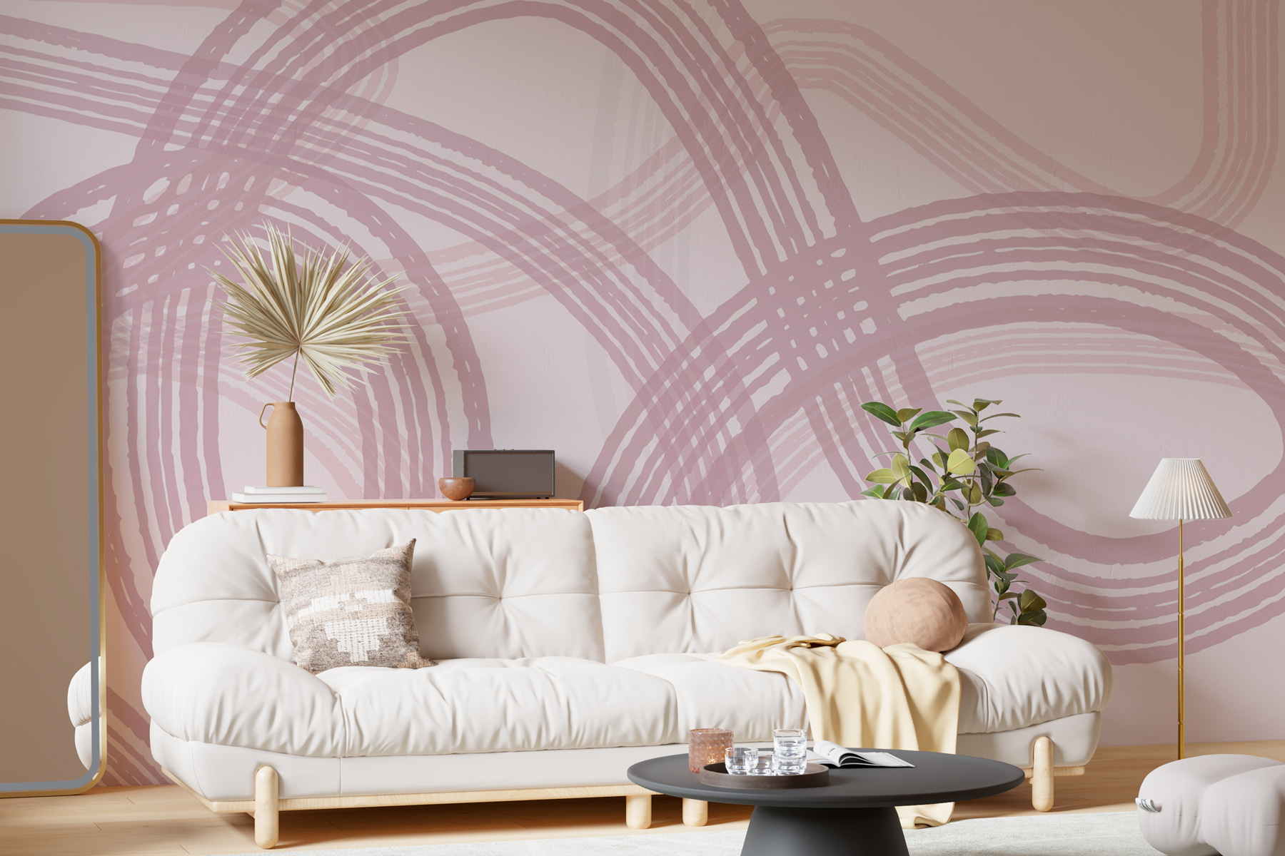 Imagine stepping into a room that feels like a breath of fresh air. This mural, with its soft pink and white circles, brings a cozy vibe that whispers warmth and creativity. The gentle swirls invite daydreams—perfect for a reading nook or a bright kitchen. Picture sipping coffee while gazing at those playful designs, letting your mind drift. It’s like having a piece of modern art right at home—just less judgmental than your favorite gallery! Elevate your space with easy elegance; this mural connects nature’s calming essence with a dash of fun. A true conversation starter!
