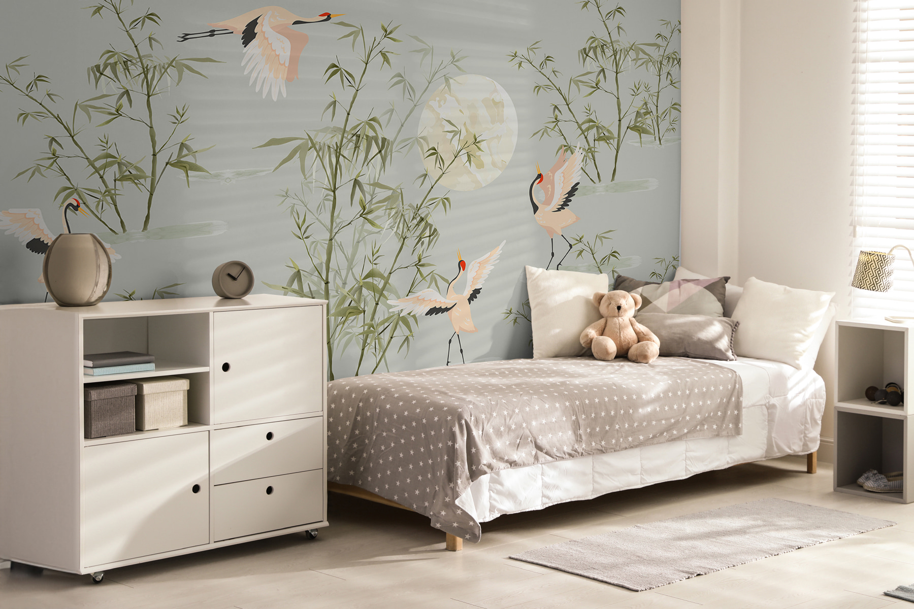Transform your space into a serene escape with “Cranes and Bamboo Under the Moon.” This wall mural brings a gentle and whimsical touch to any room. Picture it: tranquil cranes dancing amidst soft bamboo, while a glowing moon hangs overhead. It’s like having your very own slice of nature right on your walls, inviting peace and calm. Imagine sipping tea as you gaze at this stunning scene, feeling as if you’re in a quiet Japanese garden. It’s not just decor; it’s a little story waiting to unfold in your home, a perfect blend of elegance and charm that sparks joy daily.