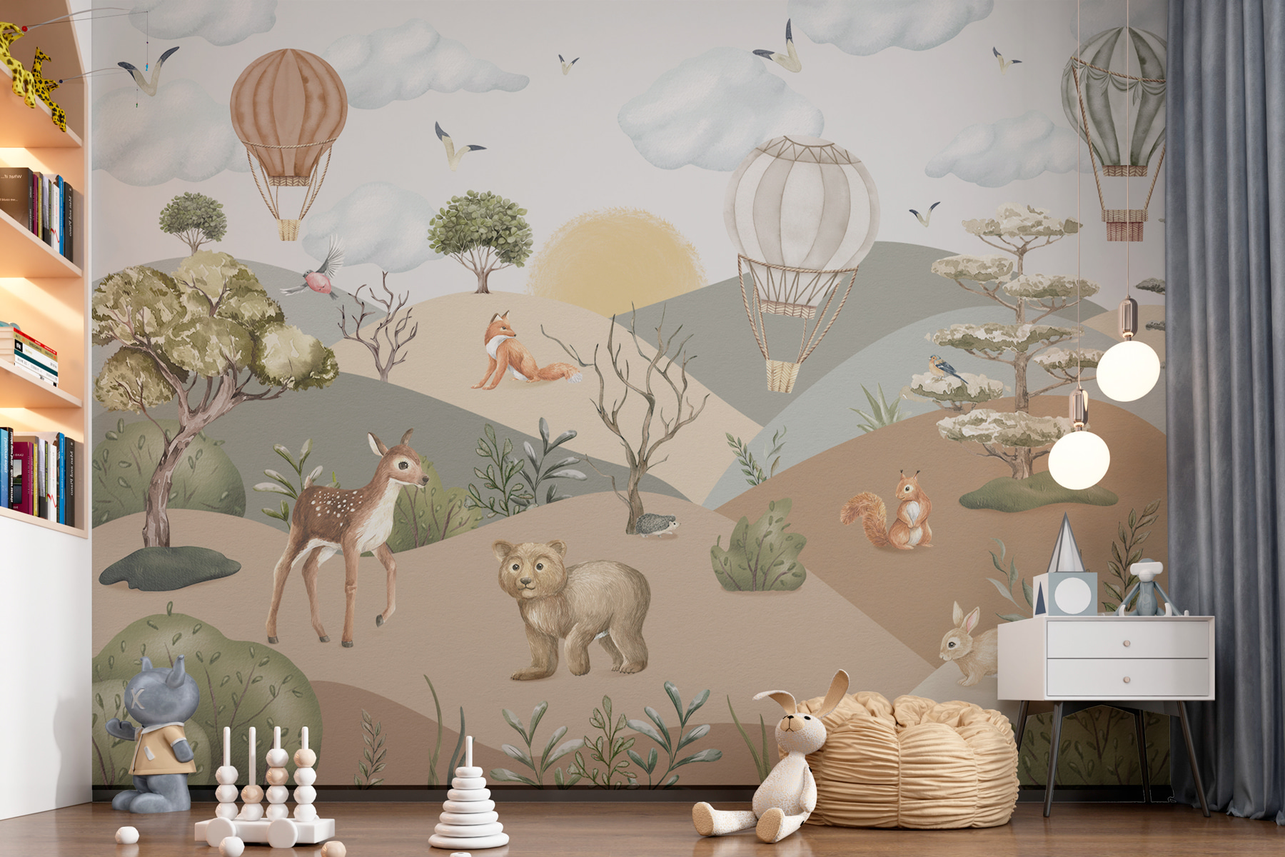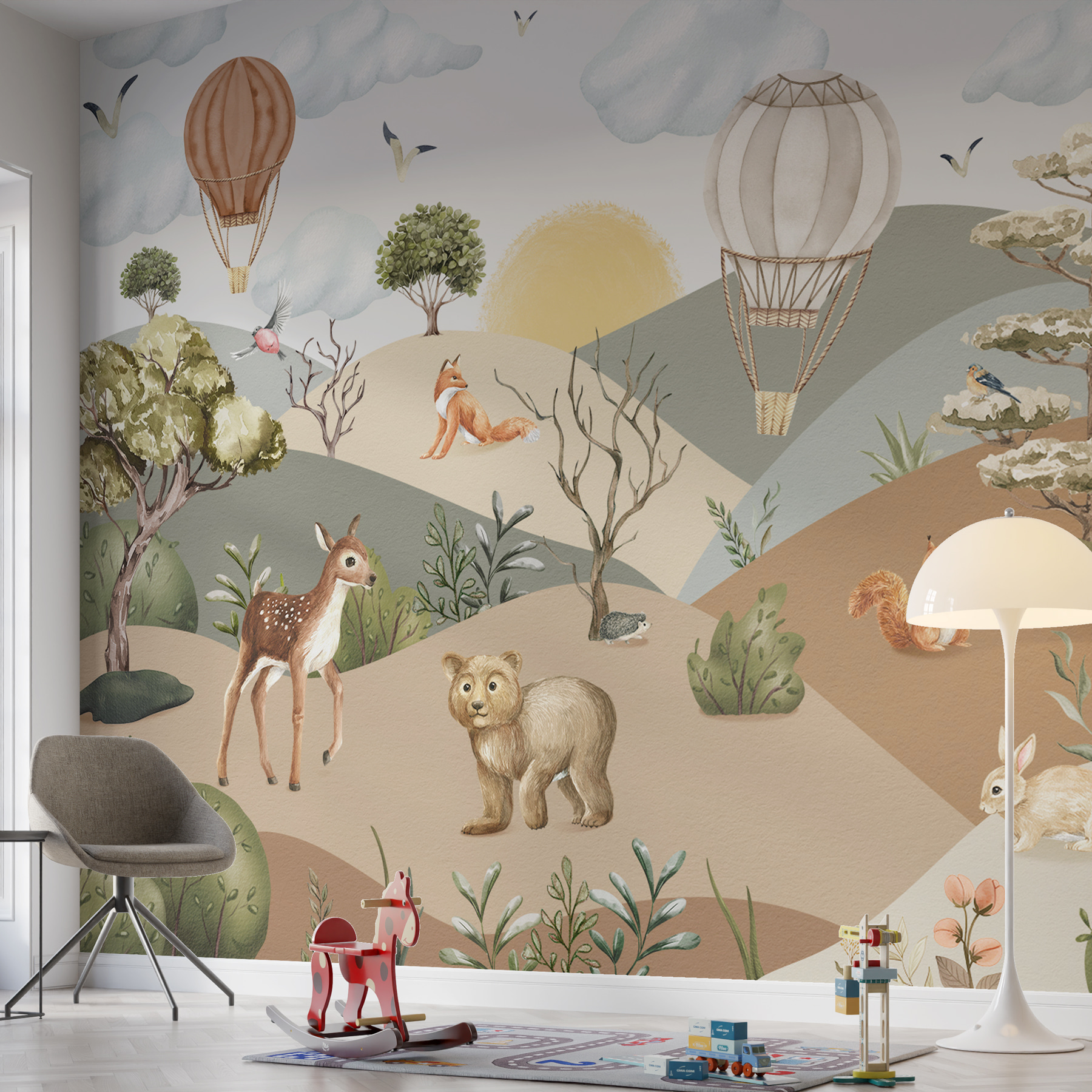 Transforming a space, even just a nook, can feel like magic, and this “Wall Murals Landscape with Animals and Hot Air Balloons” is like an open invitation to adventure. Imagine a sunny day, a fox lounging nonchalantly, and a curious deer prancing around. Those whimsical hot air balloons? They add a sprinkle of dreaminess, floating gently above a friendly forest scene—as if they’re just waiting for someone to hop in for a ride.