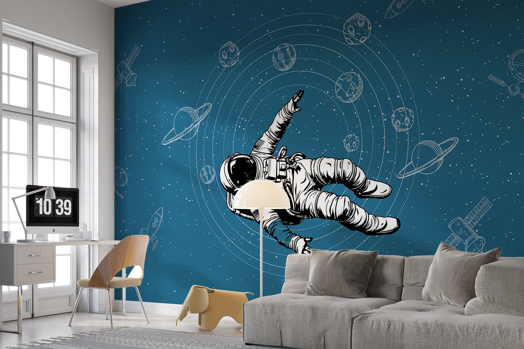Imagine stepping into a room that feels like a cozy spacecraft floating among the stars. This mural, with our brave astronaut drifting through the cosmic expanse, adds a whimsical touch to any wall. It’s perfect for dreamers and stargazers alike. The dark blue backdrop creates a sense of calm, while the playful illustrations of planets and rockets spark that childlike wonder. Picture this in a kid’s room or even a reading nook—every glance might inspire big dreams of adventure. Talk about a stellar conversation starter! Seriously, who wouldn’t want to say they’ve got a piece of the universe right at home?