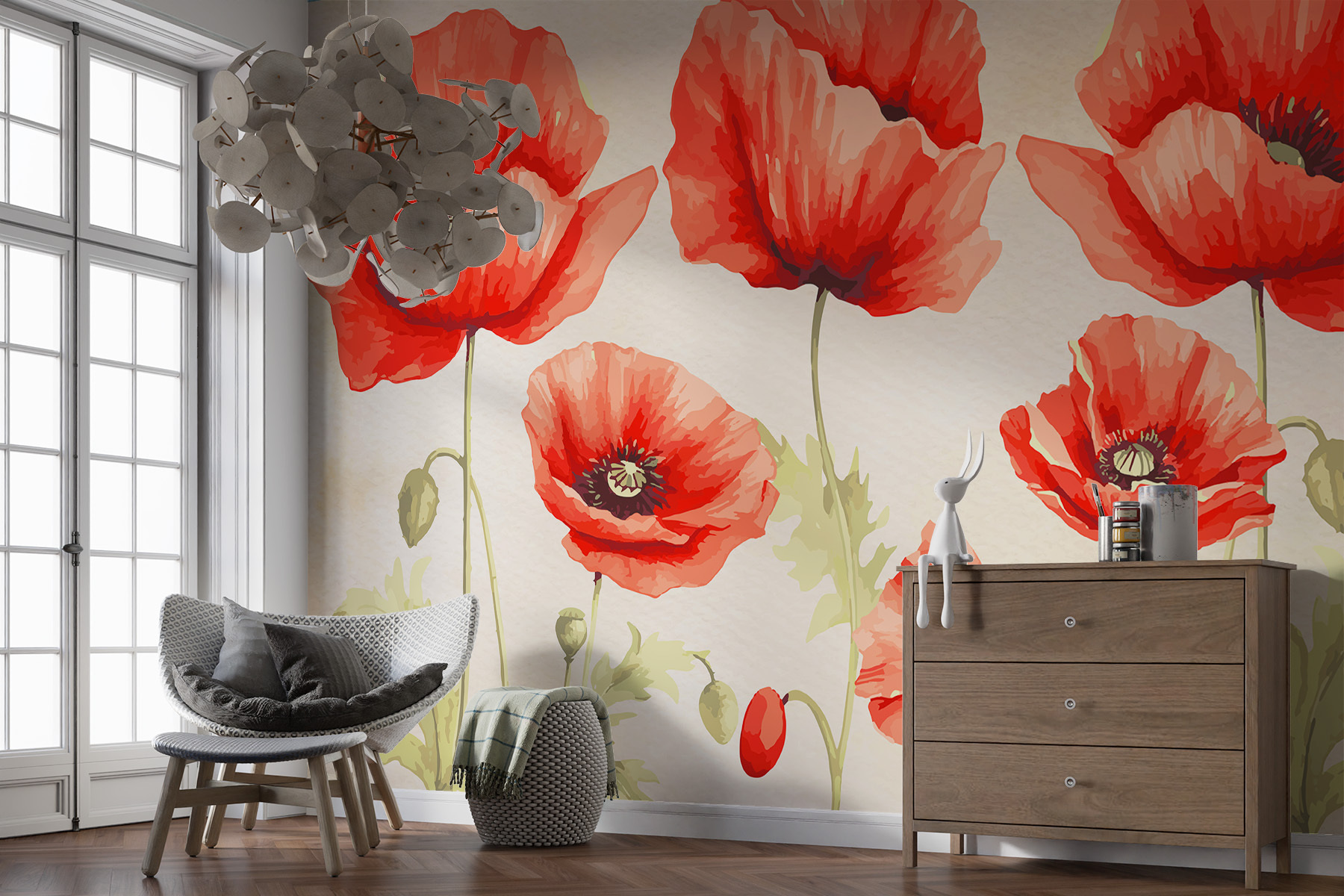Transform any space with the vibrant charm of this wall mural featuring red poppies in a delightful watercolor style. Imagine walking into a room and feeling instantly uplifted by the bold hues and delicate brushstrokes. It’s like bringing a little slice of nature indoors, minus the allergies! Friends might stop by just to admire—and maybe even ask where it’s from. Whether it’s brightening up a cozy reading nook or adding character to a dull hallway, this mural has a way of sparking conversation and joy. Way better than a plain wall, right? Perfect for anyone wanting a splash of color and personality!