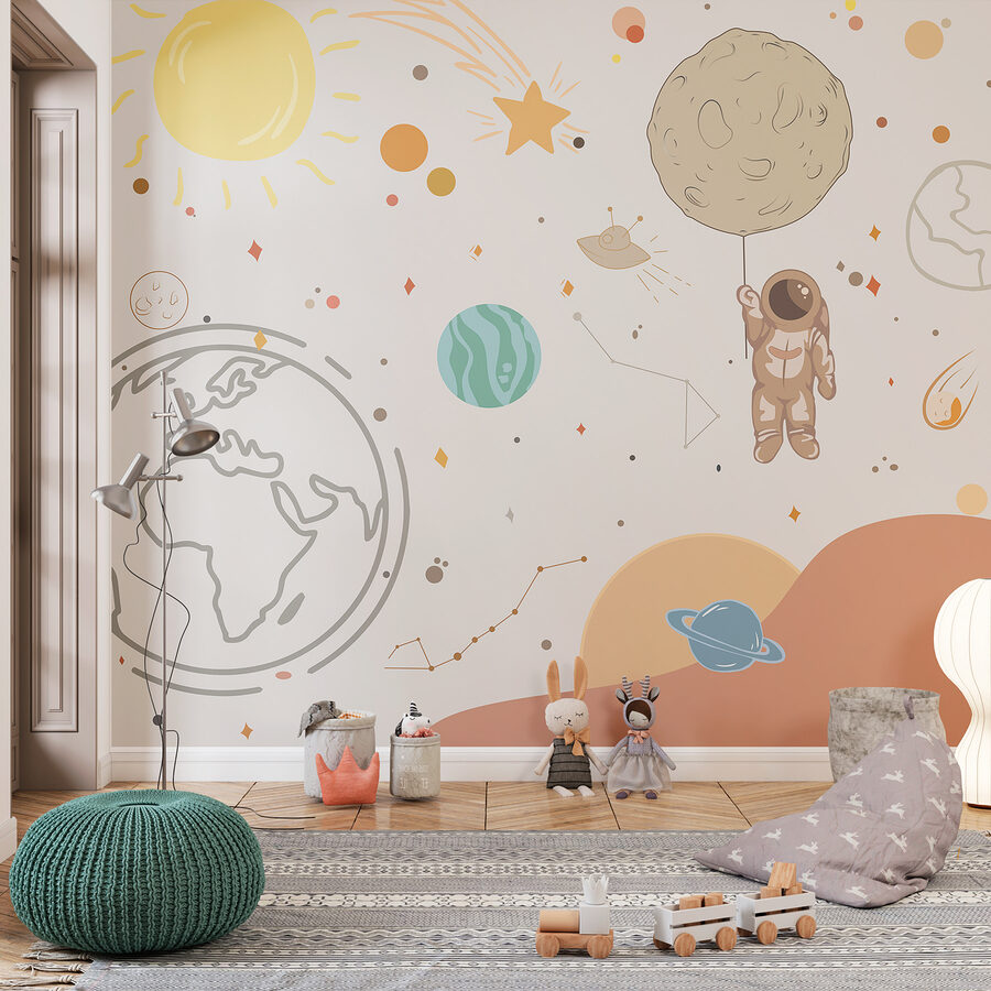 Transform your space with this whimsical “Wall Murals Cartoon of a Planet.” Imagine an astronaut casually holding the moon like a balloon—kind of makes you wonder if they’re planning a space picnic! Surrounded by vibrant planets and playful stars, this mural adds a fun touch that can spark joy in any room. Whether it’s a kid’s bedroom or a cozy reading nook, it creates a dreamy ambiance. Perfect for those who embrace adventure and a touch of silliness. Plus, it’s a great conversation starter; who wouldn’t stop to chat about space exploration? So, go ahead, let that wall tell a story!