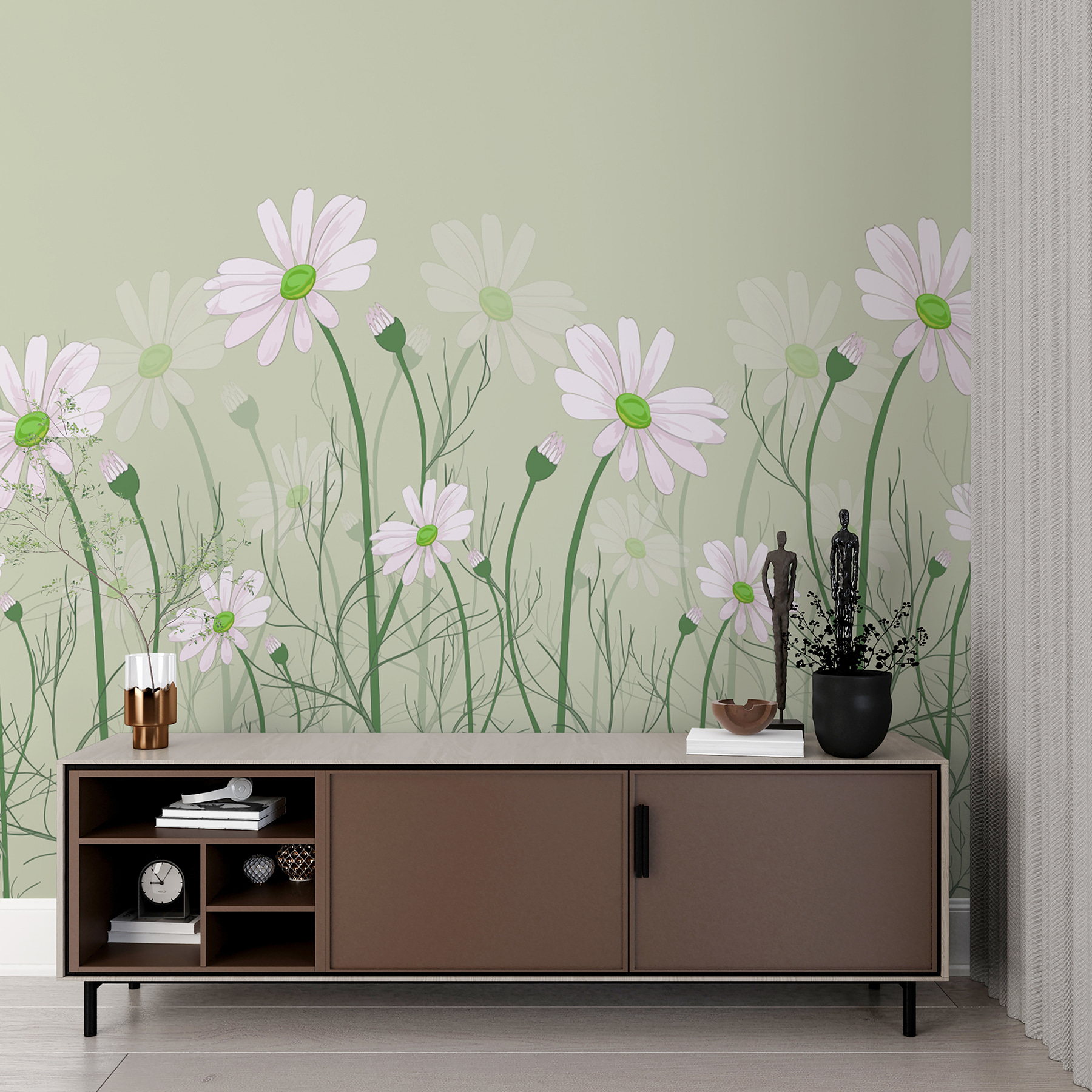 Transform your space into a serene garden with the “Blooming Daisies” wall mural. Picture this: walking into a room that feels like a gentle spring morning, with daisies stretching toward the sky on a soft green backdrop. It’s not just a mural; it’s an invitation to breathe deeper and smile a little wider. Imagine sipping your morning coffee while gazing at these cheerful flowers, your worries fading like morning mist.