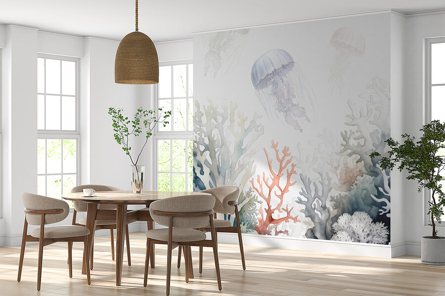 Transform your walls into a vibrant underwater playground with this stunning mural of jellyfish drifting over colorful corals. It’s like having a slice of ocean magic right at home! The soft hues swirl together, inviting you to get lost in their beauty. Picture this: a cozy room bathed in gentle blues and coral reds, where every glance feels like a mini escape to the sea. The jellyfish gracefully float, making it impossible not to smile. Perfect for making any space feel fresh and alive, this mural whispers tranquility and wonder, adding a splash of personality that’s just hard to ignore. Who wouldn’t want to dive into that?