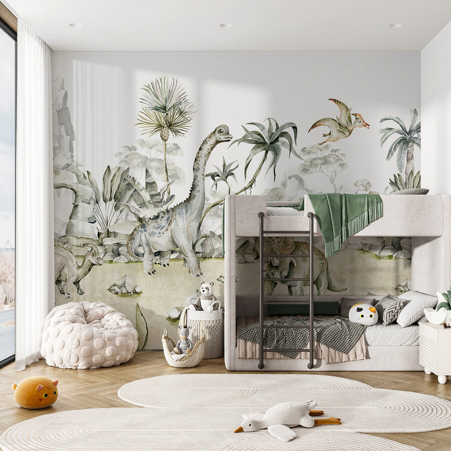 Transform your space with this enchanting watercolor mural featuring adorable dinosaurs and lush plants. It’s like a trip to a prehistoric paradise—minus the actual dinosaurs, of course! Imagine walking into a room where a gentle Brontosaurus munches peacefully on ferns, while a curious Triceratops roams nearby. It sparks a sense of adventure, right? Perfect for kids’ rooms or playful living areas, it brings a splash of color and whimsy. Plus, it’s a great conversation starter—just wait for those curious friends to ask where you found such a gem!