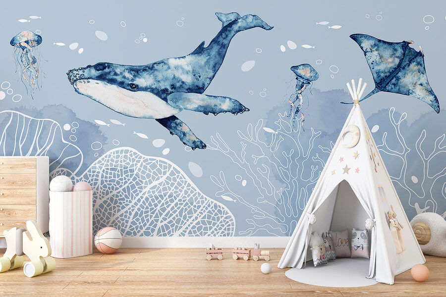 Dive into a vibrant ocean dream with this stunning wall mural featuring a majestic whale gliding gracefully through a lively underwater scene. Picture it brightening up a dull space, where every glance feels like a mini-vacation. The soothing blues and lively sea life—jellyfish floating by, playful coral—invite calm and wonder. Imagine friends stopping mid-conversation, eyes wide, pointing at the mural in pure awe. It’s not just decor; it’s an escape. Whether it lives in a cozy living room or a breezy beach house, this mural transforms the vibe. Who wouldn’t want to swim with whales, even if it’s just on their wall?