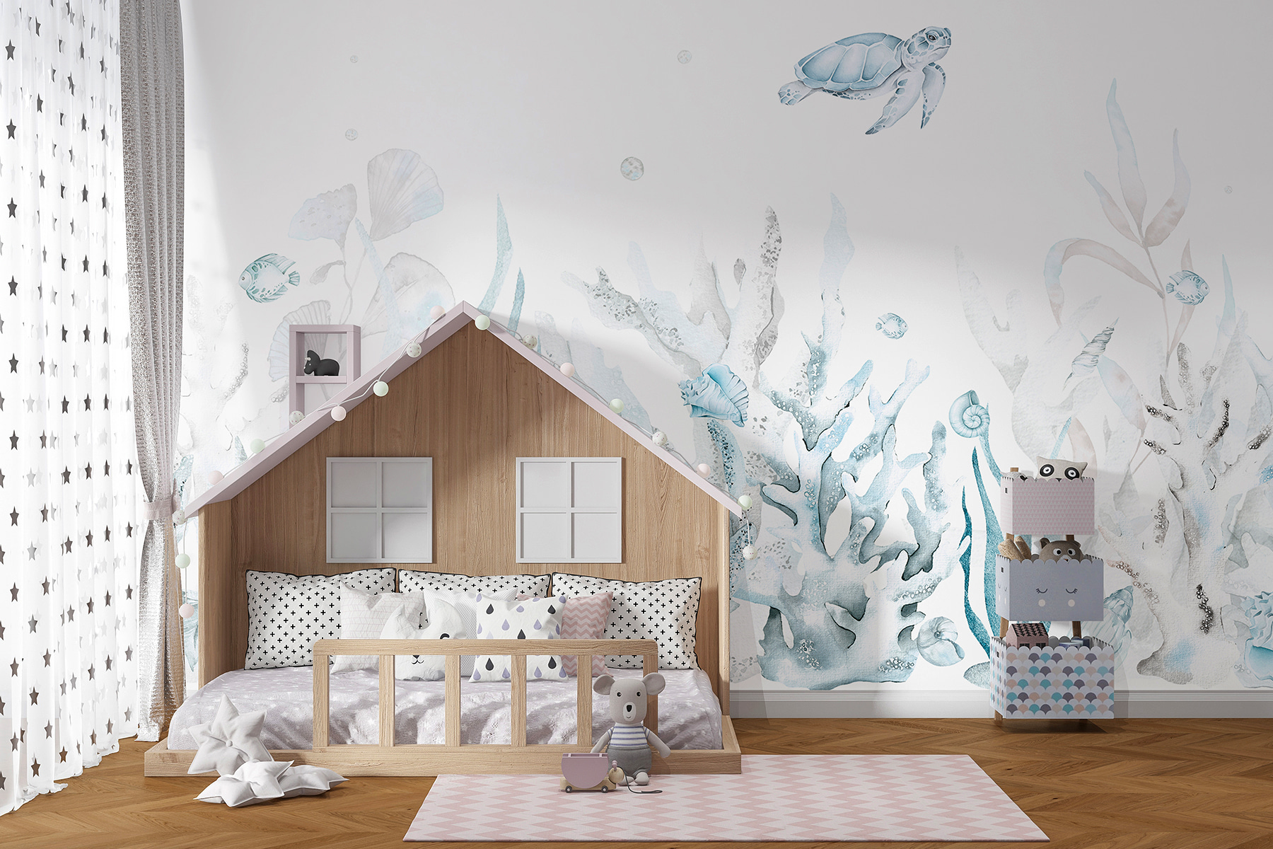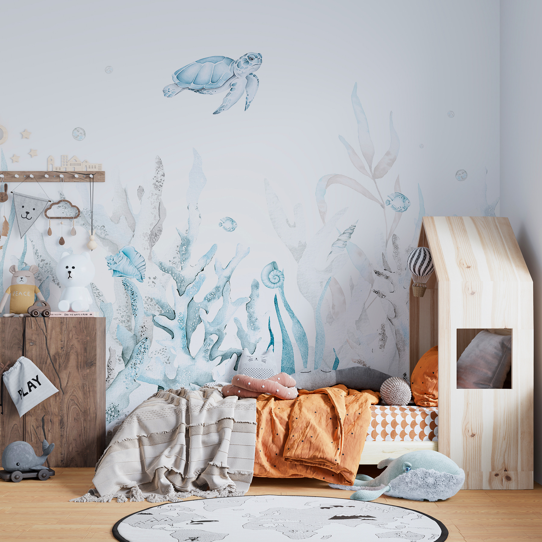 Transform any room into an underwater escape with this serene mural featuring a gentle turtle gliding through a dreamy ocean scene. This design brings a touch of calm—imagine walking into your space, feeling the hustle and bustle fade away. The soft colors and flowing lines make it perfect for a cozy nook or a tranquil bedroom. It’s like having a mini-vacation right on your walls! And let’s be honest, who doesn’t love a good turtle? Perfect for nature lovers and those who just want to add a little chill vibe to their home. Dive in and let the tranquility wash over you!