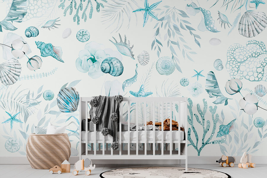 Transform any space into a soothing retreat with this lovely mural, adorned with seashells and soft foliage in dreamy blue hues. Imagine walking into a room that feels like a gentle sea breeze whipped through, offering a touch of the seaside right at home. The delicate watercolor design dances across the walls, bringing whimsy and serenity. It’s perfect for creating a calming vibe in a bedroom, or even a cozy reading nook. Picture yourself curling up with a book, sipping tea, while the soft colors wrap around you like a warm hug. A true escape, without ever leaving your home.
