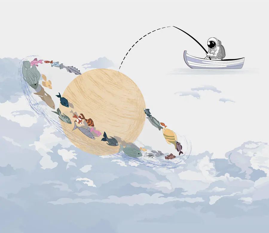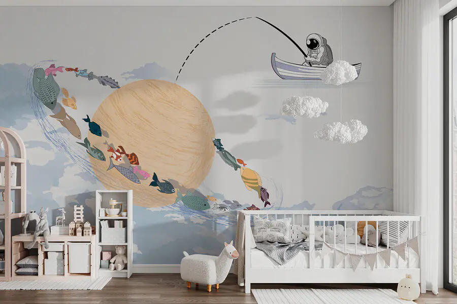 Transform your space with this whimsical mural that brings a splash of fun and creativity to any wall. Picture it: a cozy room where bright cartoon fish swim around a planet, while an astronaut dangles a line—wondering if he’ll catch anything today. It’s a delightful mix of dreamy skies and playful vibes that can make anyone smile. This mural is perfect for a kid’s room or even a quirky touch in a living area. Talk about a conversation starter! With such a unique design, each glance is a mini adventure, making every day feel just a little more magical.