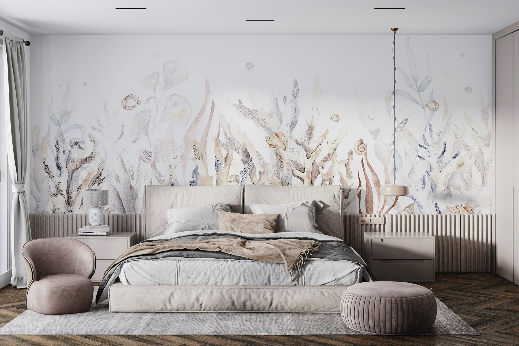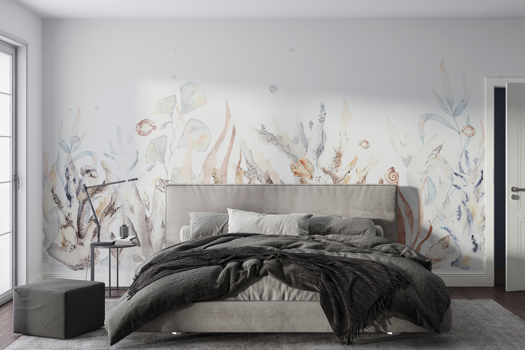 Dive into a serene underwater paradise with this stunning mural, “Underwater Garden with Shells and Fish.” Imagine transforming a bland wall into a tranquil ocean retreat right in your home. The delicate hues and graceful marine life invite a sense of calm, like a gentle wave washing over you. Picture kicking back with a book, surrounded by enchanting seashells and playful fish that seem to dance across your walls. It’s like bringing a slice of the ocean’s whisper into your living space, making everyday moments feel a bit more magical. Perfect for nature lovers or anyone dreaming of the sea!