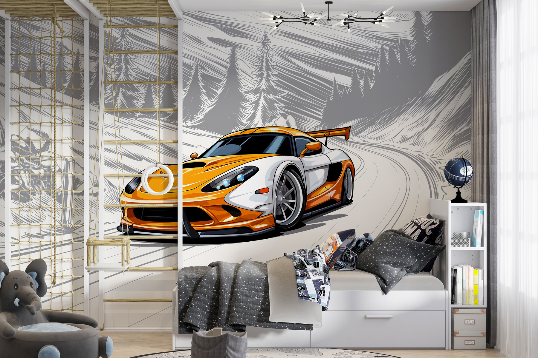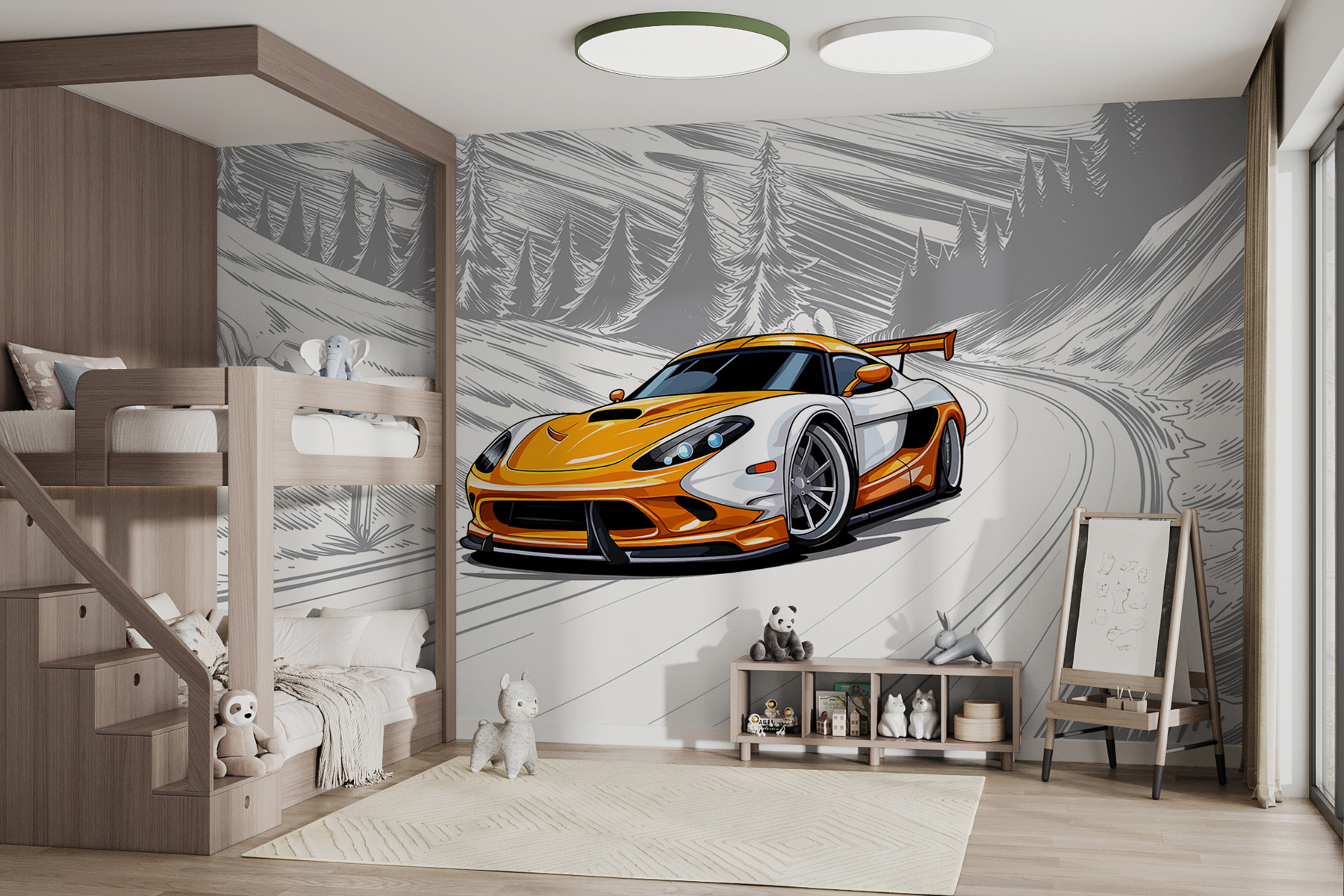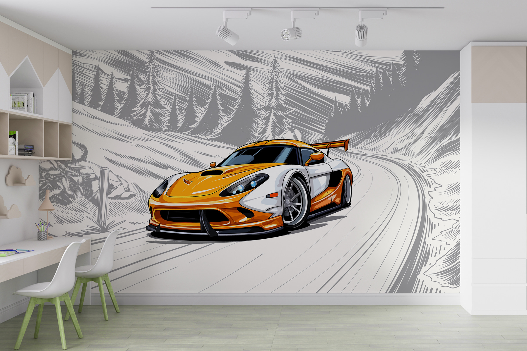 Rev up your space with this vibrant wall mural featuring a striking yellow and white sports car zooming through a snowy landscape. Imagine waking up to this burst of energy every day—it’s like having a miniature racetrack right in your living room. The way the car pops against the soft gray and white backdrop creates a sense of thrill. It’s perfect for car enthusiasts, or anyone who just loves a bit of adventure. And hey, who wouldn’t want a unique piece that sparks conversations or inspires daydreams of winter road trips? This mural’s got personality, charm, and just the right touch of excitement to make any wall come to life!
