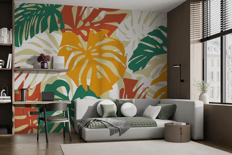 Transform any room with this lively mural of colorful leaves on a crisp white backdrop. It’s like inviting a mini jungle right into your space, complete with all the playful energy that foliage brings. Picture this: morning coffee feels more vibrant, and lazy afternoons seem a bit breezier. The bold greens and warm tones play nicely together, giving off that tropical vibe without the need for sunscreen. It’s a perfect backdrop for cozy chats or even solo dance parties. A quick splash of nature, right on your walls, making every day feel like a little getaway.