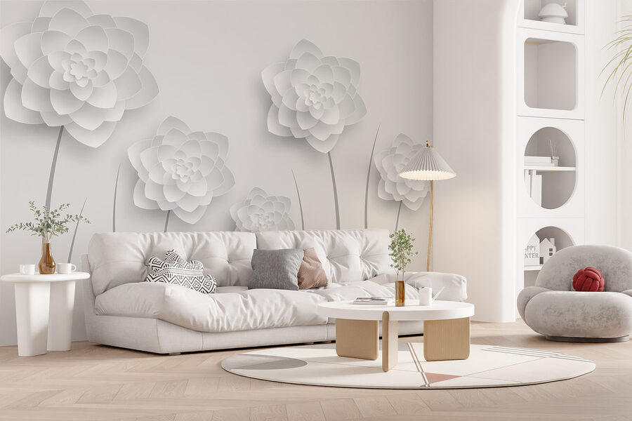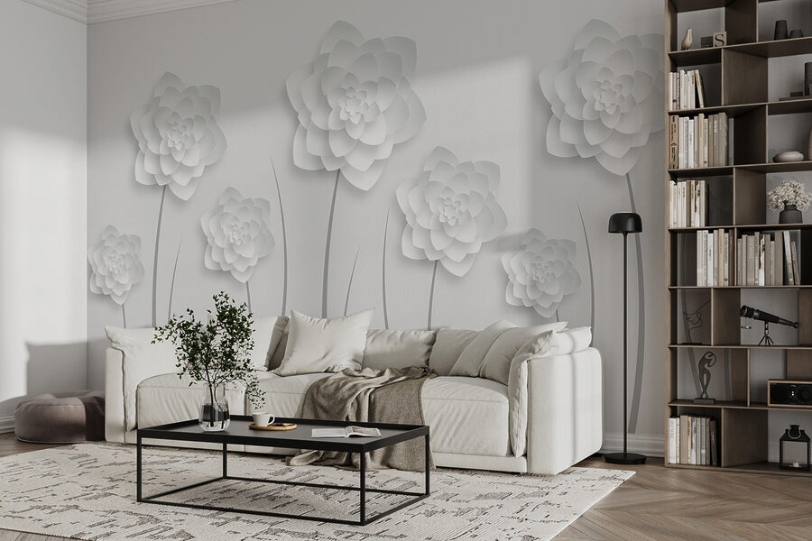 Welcome a touch of whimsy into your home with this stunning wall mural featuring delicate white paper flowers dancing on a soft gray background. It’s like having a gentle garden that never wilts—perfect for those who might forget to water their plants! Imagine sipping your coffee as sunlight filters through, casting playful shadows of these blooms. This mural brings calm vibes and a hint of nature indoors, making spaces feel fresh and airy. Whether it’s a cozy reading nook or a chic hallway, these elegant flowers will inspire a smile and maybe even a daydream or two. A simple touch, yet they’re sure to spark conversation—who knew flowers could be so enchanting?
