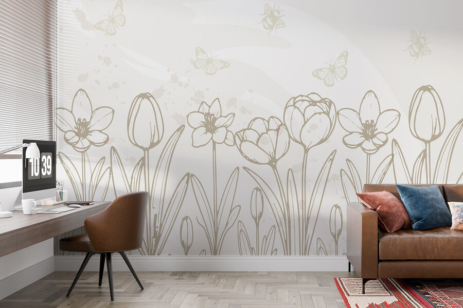 Transform any space with this charming wall mural featuring delicate line drawings of flowers and butterflies. Imagine stepping into a serene garden where every glance feels like a breath of fresh air. The soft, muted tones bring a calming vibe, perfect for a cozy reading nook or a lively dining area. Picture enjoying your morning coffee as gentle butterflies flit across your wall—just enough whimsy to spark joy. This design might even inspire a little daydreaming or a stroll through nature, all from the comfort of home. A delightful touch for anyone looking to bring a touch of the outdoors inside!
