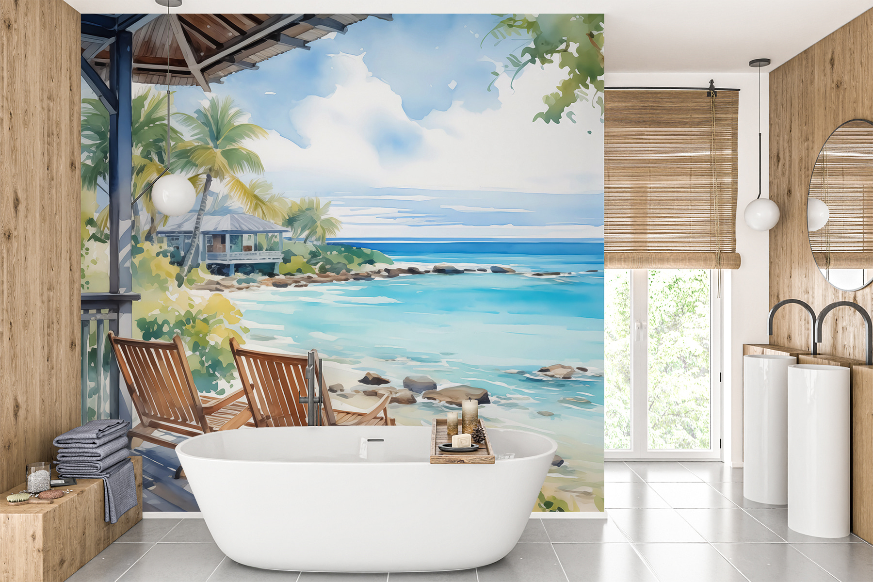 Transform your space with this delightful wall mural, featuring a watercolor scene of cozy chairs on a sun-kissed deck, overlooking a stunning beach. Just imagine sinking into one of those chairs, the sound of waves gently crashing in the background, while sipping a refreshing drink—ahh, bliss! This mural brings a touch of nature indoors, making every glance feel like a mini getaway. Brighten up a living room or bring a serene vibe to a bedroom. It’s like a vacation for your walls—perfect for those who love to escape through art!