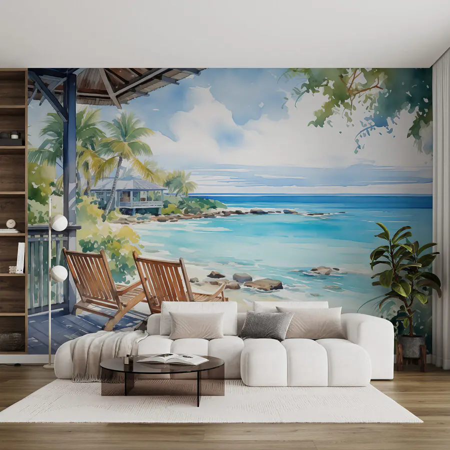Transform your space with this delightful wall mural, featuring a watercolor scene of cozy chairs on a sun-kissed deck, overlooking a stunning beach. Just imagine sinking into one of those chairs, the sound of waves gently crashing in the background, while sipping a refreshing drink—ahh, bliss! This mural brings a touch of nature indoors, making every glance feel like a mini getaway. Brighten up a living room or bring a serene vibe to a bedroom. It’s like a vacation for your walls—perfect for those who love to escape through art!
