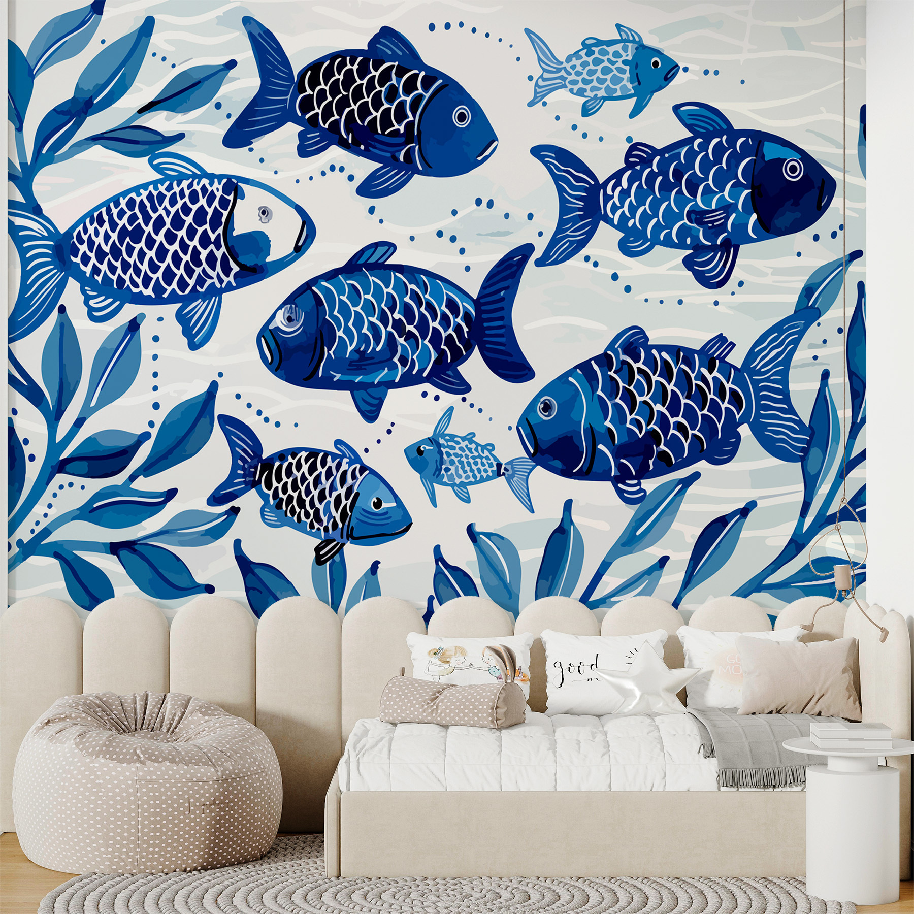 Diving into this mural is like taking a serene plunge into crystal-clear waters, where a vibrant school of blue fish swims gracefully among leafy greens. It’s not just wall decor; it’s an invitation to daydream about sandy beaches and sunlit waves. Picture a cozy living room where visitors can’t help but smile, maybe even get a little lost in thought while sipping their coffee. The calming hues can turn any space into a tranquil oasis, perfect for those moments when life feels a bit too hectic. Imagine waking up to this view—seriously, who wouldn’t feel a little more zen? Whether it’s brightening up a child’s room or adding character to a home office, these charming fish glide through your wall, bringing a splash of joy and a hint of adventure.