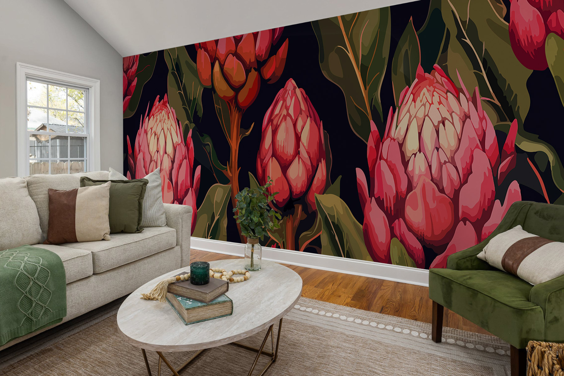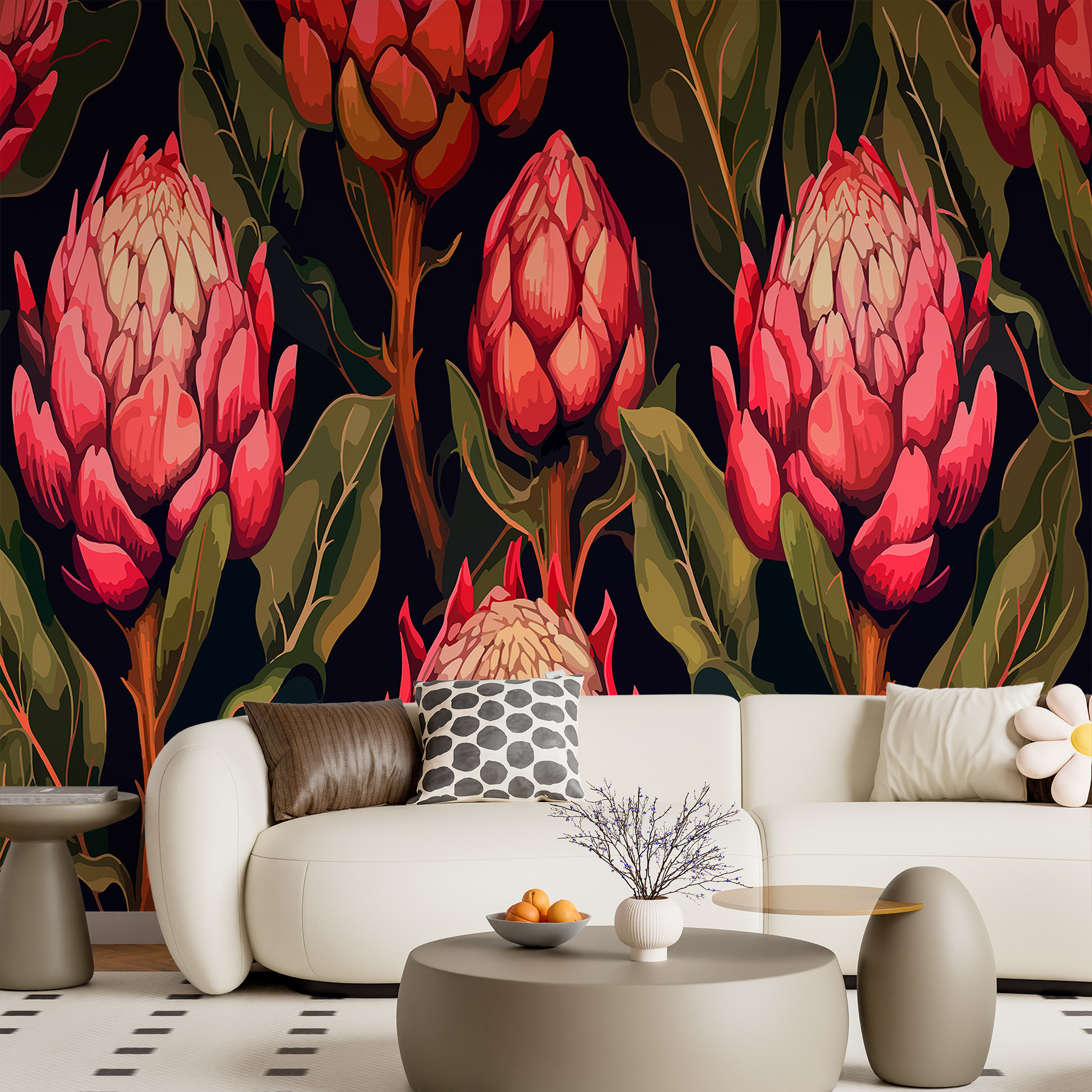 Transform any room with this stunning mural of blooming proteas in vibrant hues. Imagine walking into a space where these gorgeous flowers jump out, filled with life and color—perfect for those days when a little inspiration is needed. It’s like bringing a garden indoors without all the watering! The rich colors dance against a dark backdrop, making it a conversation starter for guests. Feeling a bit gloomy? This mural will instantly brighten the mood! Whether it’s the living room or a cozy nook, these flowers add a touch of nature’s wild beauty. Who needs a trip to the botanical garden when this lively landscape is right on the wall? Perfect for anyone who loves flowers or just wants a pop of joy in their space!
