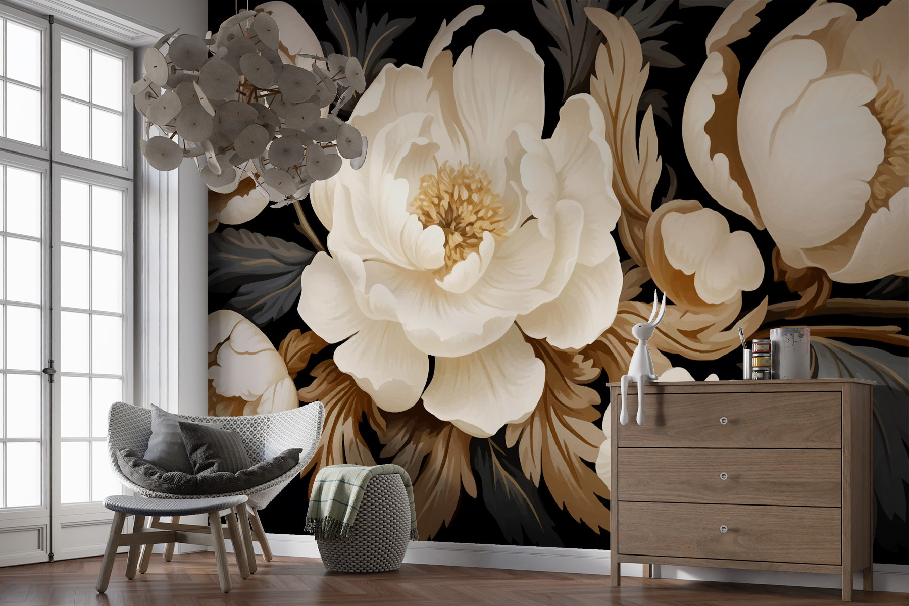 Transform your space with the “Elegant Blooms” wall mural, where blossoms come to life in stunning detail. Imagine stepping into a serene garden, surrounded by luxurious white peonies, their petals whispering elegance. Perfect for a cozy reading nook or that empty wall begging for a little flair, this mural evokes feelings of peace and beauty. The deep black background really makes those flowers pop—like they’re doing a little dance, just for you. This isn’t just decor; it’s a mood. Friends will stroll in, do a double-take, and maybe even ask where the flower shop is. Who knows? It might just inspire a conversation about the beauty of nature—or lead to a fun plant-buying spree!