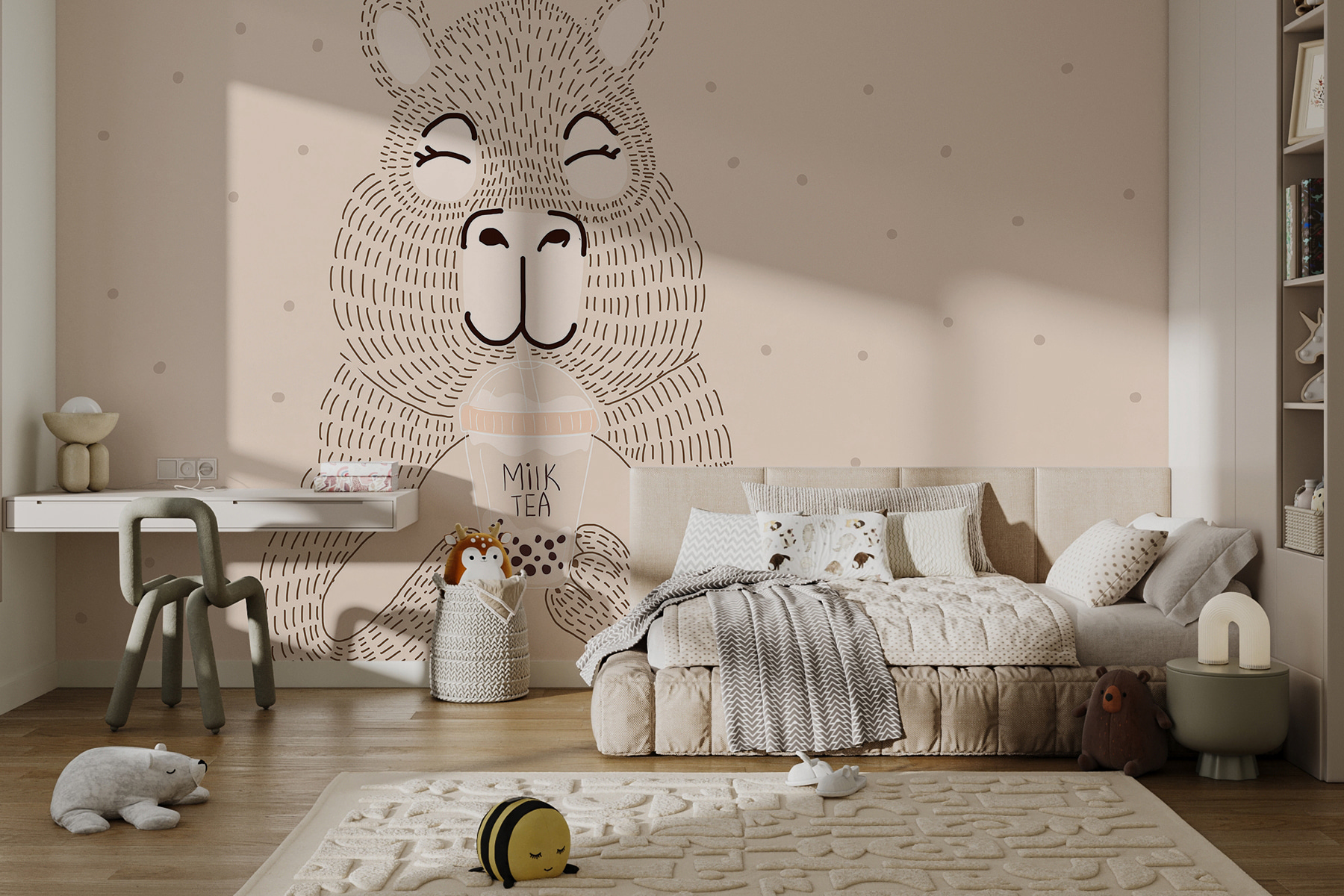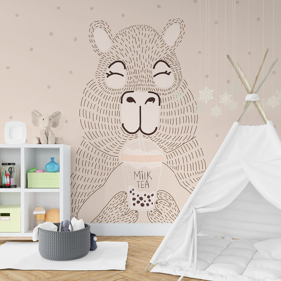Imagine a sunny afternoon, cozy at home, and you glance up to this delightful bear mural, grinning with that bubble tea. It’s like he’s inviting you to join him for a chill drink, right? This playful piece brightens any wall, adding a dash of whimsy and warmth to your space. Perfect for a living room or nursery, it’s sure to spark smiles and maybe even inspire some fun conversations. With those fun, soft lines and a gentle color palette, it’s like a hug in mural form, effortlessly making any room feel just a bit more inviting and cheerful. Who wouldn’t love a bubble tea buddy watching over them?
