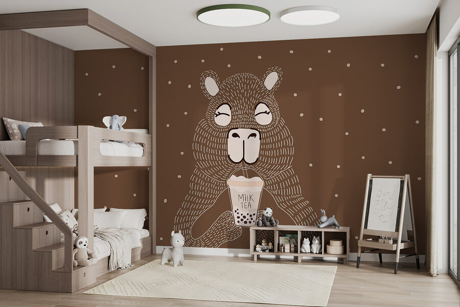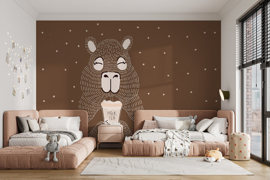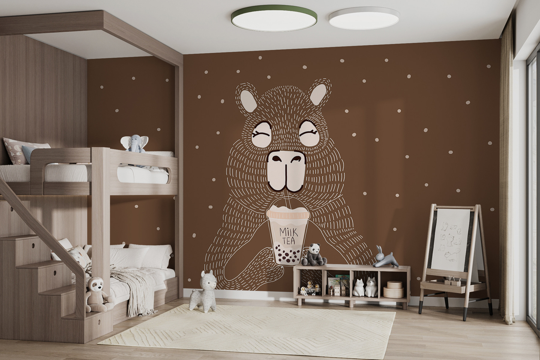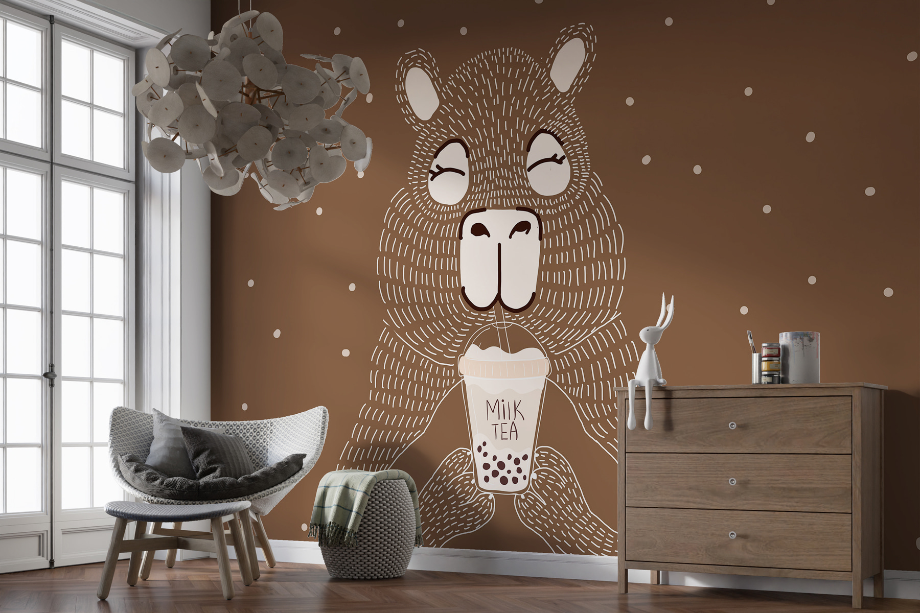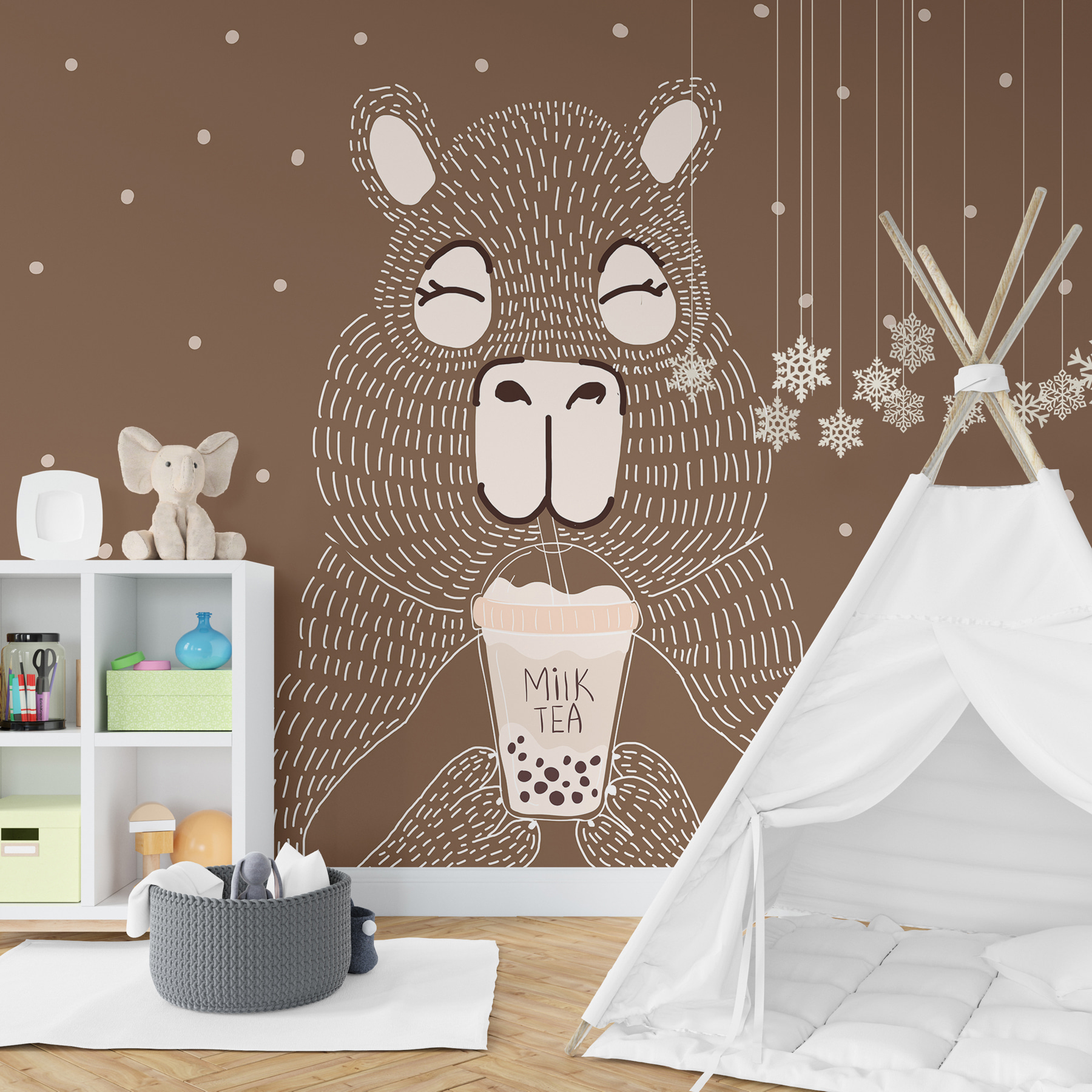 Transform any space with this whimsical wall mural featuring a cartoon animal happily sipping on a cup of milk tea. Imagine a cozy café vibe right at home! This cheerful creature brings a touch of fun and warmth, making it perfect for a playful kid’s room or a quirky living area. The soft brown background and charming design invite smiles and laughter. Picture hosting friends; they can’t help but comment on this delightful piece. It’s not just decor—it’s an instant conversation starter. Grab a cup of your favorite drink and let this mural brighten your day!
