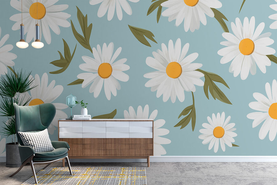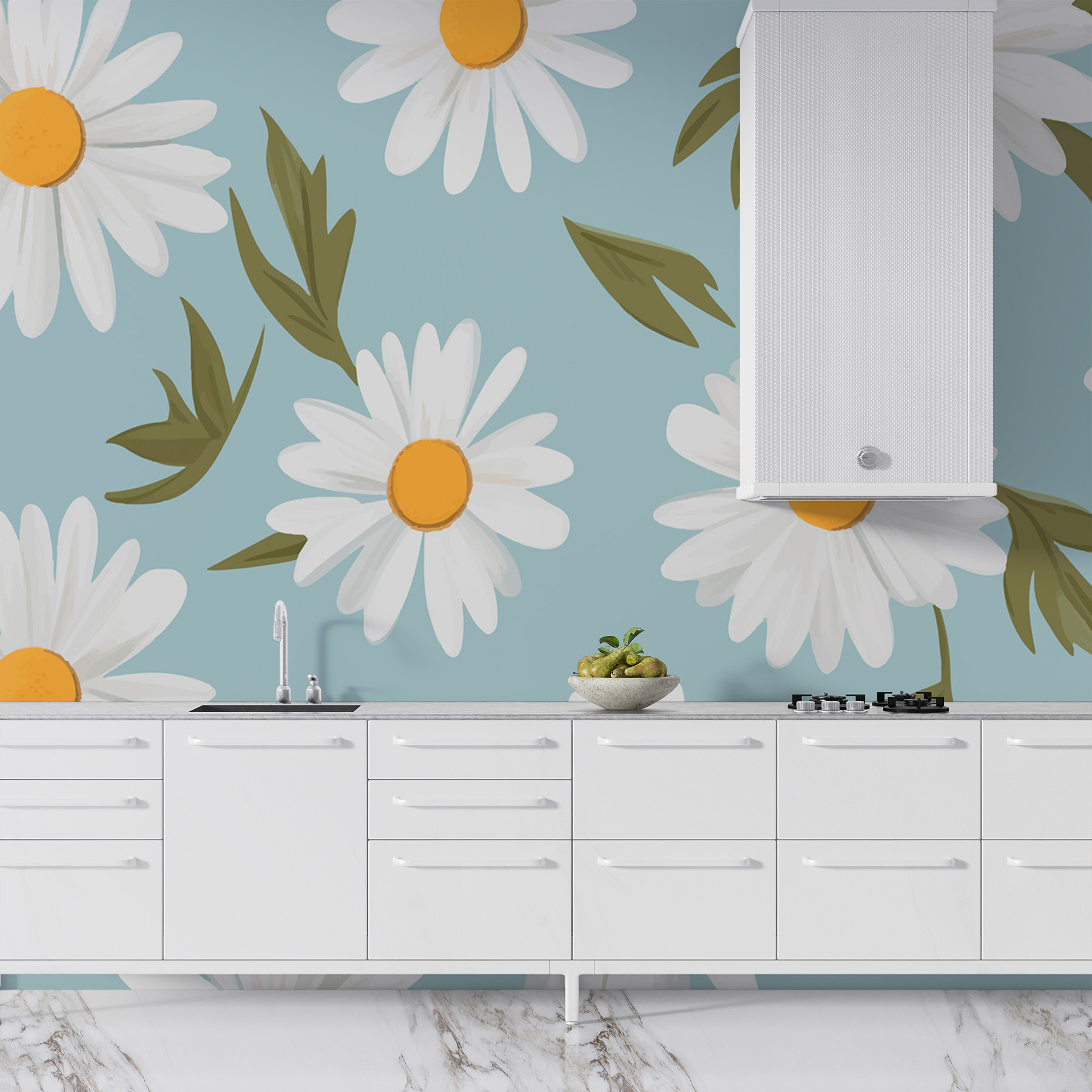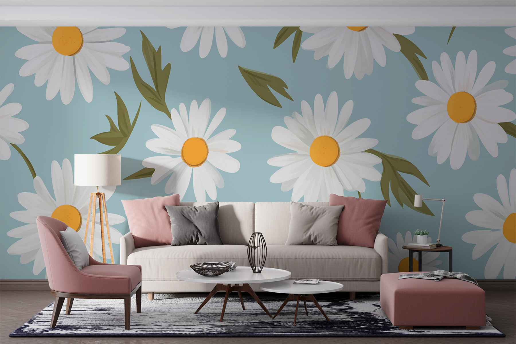 Transform any space with this enchanting wall mural featuring a delightful pattern of white flowers and green leaves. Imagine waking up to a garden on your walls, where cheerful daisies sway gently in a calming blue backdrop. It’s like bringing a little slice of nature indoors! Perfect for a cozy living room or a bright kitchen nook, this mural could spark plenty of compliments from friends. Just picture sipping your morning coffee surrounded by blooming florals—talk about a mood booster! Give your walls some personality and let the floral fun begin!