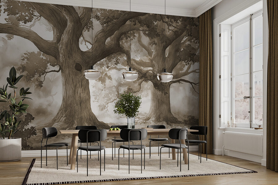 Transform any wall into a secret escape with this enchanting mural of trees, complete with a whimsical hole in the trunk. It’s like nature decided to drop by your living space. Imagine curling up with a good book, the soft hues wrapping around you, making your room feel like a cozy forest hideaway. Perfect for a tranquil reading nook or a magical child’s bedroom, it brings the outdoors inside without the bugs—bonus! There’s something calming about the gentle curves of the branches, like they’re inviting you to come play. Ideal for nature lovers or anyone looking to add a touch of serenity to their home.