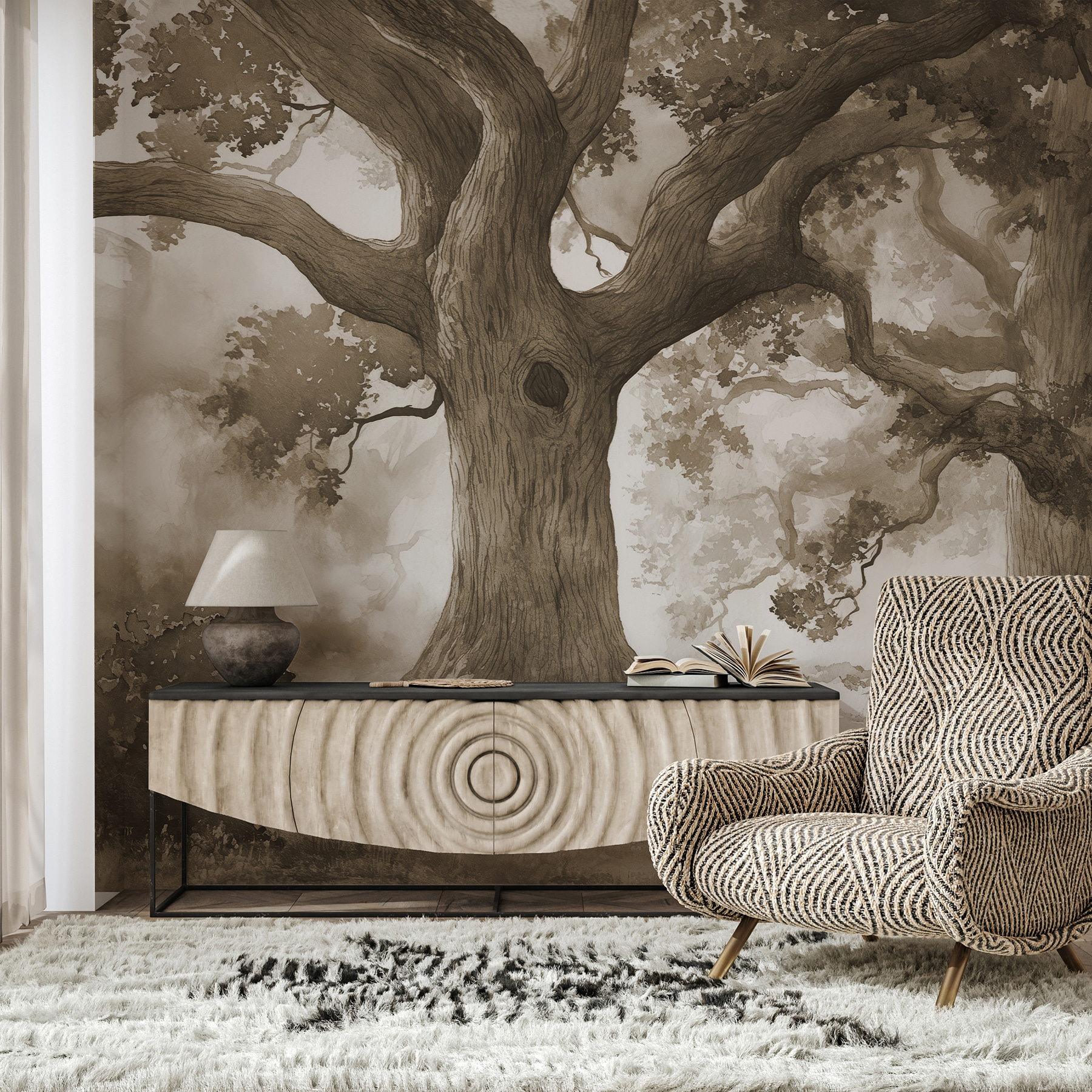 Transform any wall into a secret escape with this enchanting mural of trees, complete with a whimsical hole in the trunk. It’s like nature decided to drop by your living space. Imagine curling up with a good book, the soft hues wrapping around you, making your room feel like a cozy forest hideaway. Perfect for a tranquil reading nook or a magical child’s bedroom, it brings the outdoors inside without the bugs—bonus! There’s something calming about the gentle curves of the branches, like they’re inviting you to come play. Ideal for nature lovers or anyone looking to add a touch of serenity to their home.