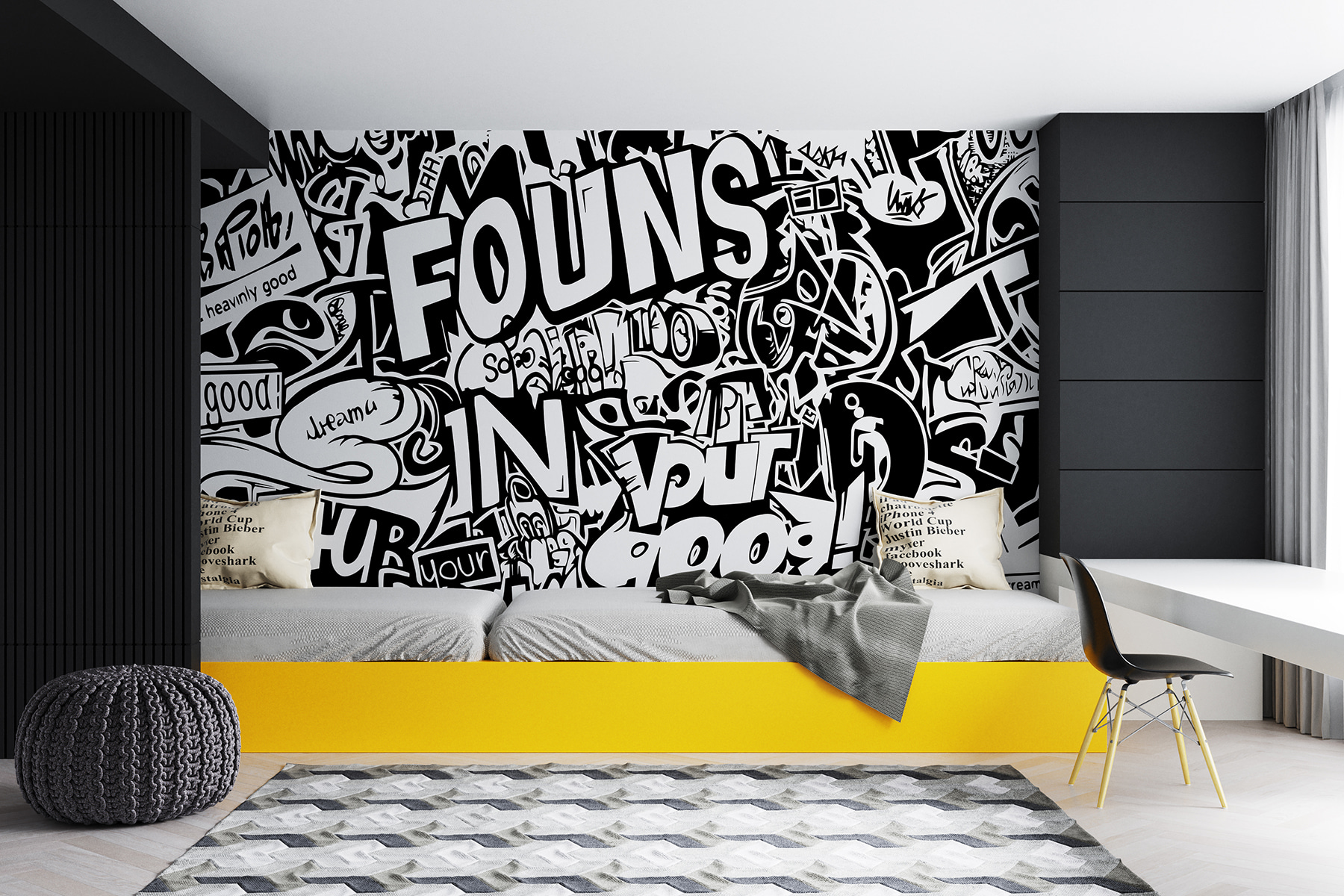 Transform a bland wall into an eye-catching masterpiece with this Black and White Graffiti mural. It’s like having a hip street corner right in your living room! The playful mix of bold words and quirky doodles brings a vibe that’s both energetic and calming—who knew contrast could be so soothing? Picture this: a cozy afternoon, your favorite playlist jamming in the background, and guests can’t help but stop and admire. It’s a conversation starter, an artwork that gives a wink and a nod to creativity. Perfect for a home office, playroom, or even that boring hallway. This mural is like a hug—warm, inviting, and just a little bit wild.