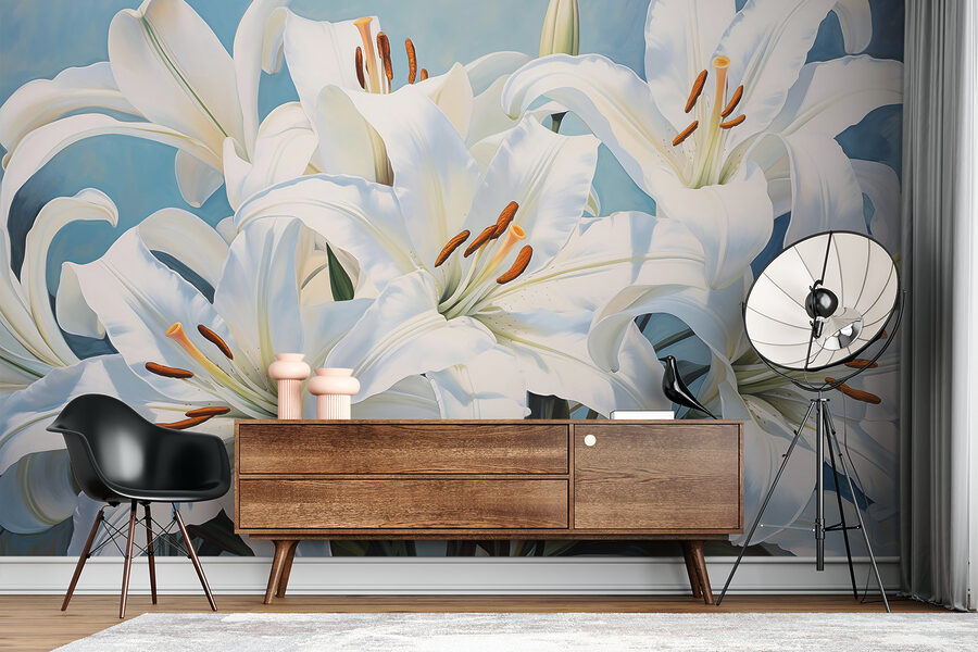 Imagine stepping into a room adorned with the enchanting sight of “Elegant White Lilies in Bloom.” This mural isn’t just a wall decoration; it’s like an invitation to a serene garden party right in your living space. Those grand white lilies seem almost alive, swaying gently like they’re in a summer breeze, bringing life and joy to any wall.