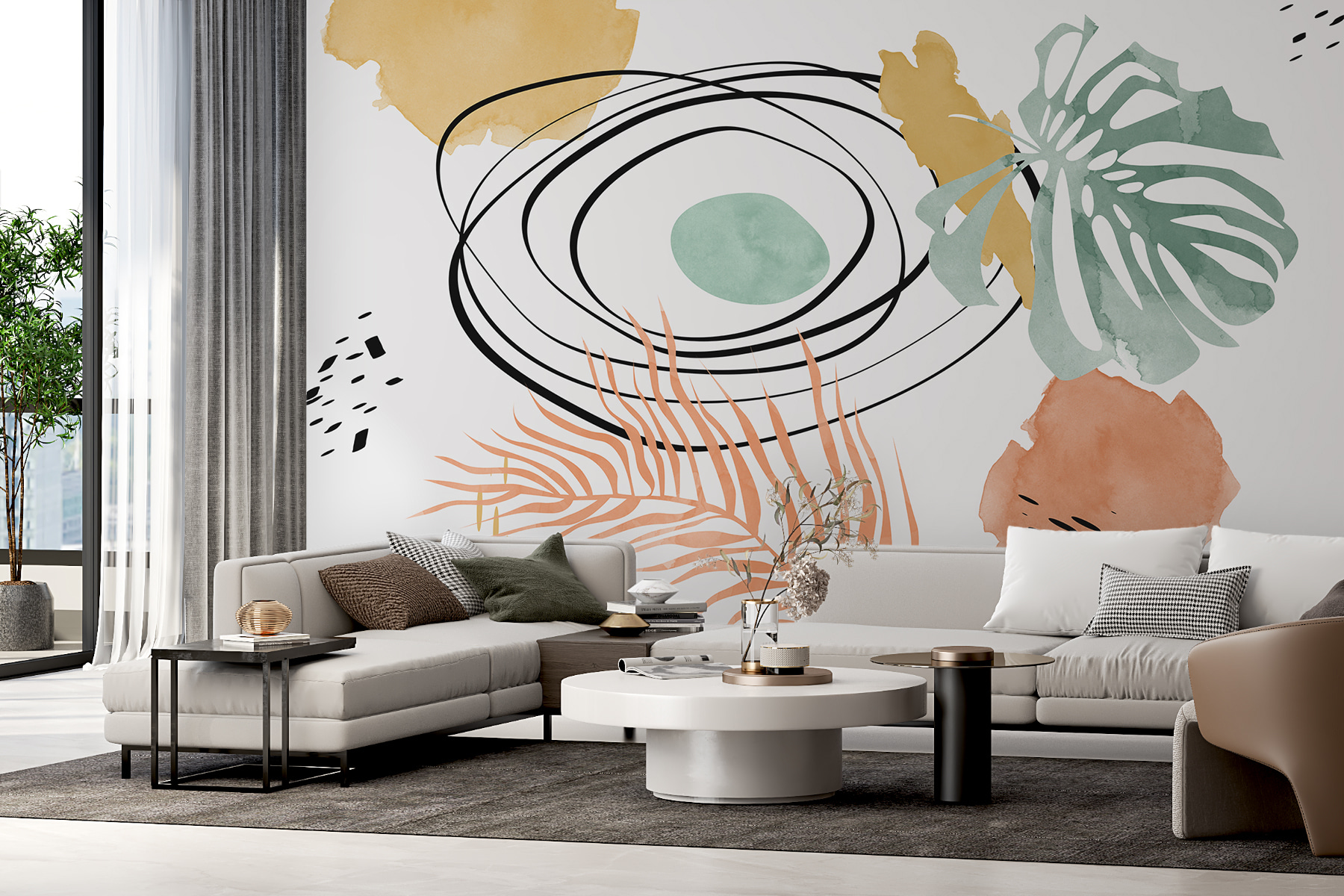 Transform any space into a serene escape with this abstract botanical watercolor mural. Imagine waking up surrounded by soft hues of green and peach, like a cozy Sunday morning. It’s got this playful vibe—curvy lines dance with splashes of color, making walls feel alive. Perfect for a reading nook or that awkward hallway that needs a sprinkle of charm. Friends might walk in and think, “Wow, did a garden just bloom here?” It’s not just decor; it’s a little piece of joy right on your wall. Catch a glimpse, and you’ll instantly feel a wave of calm wash over you. Who knew art could be so uplifting?