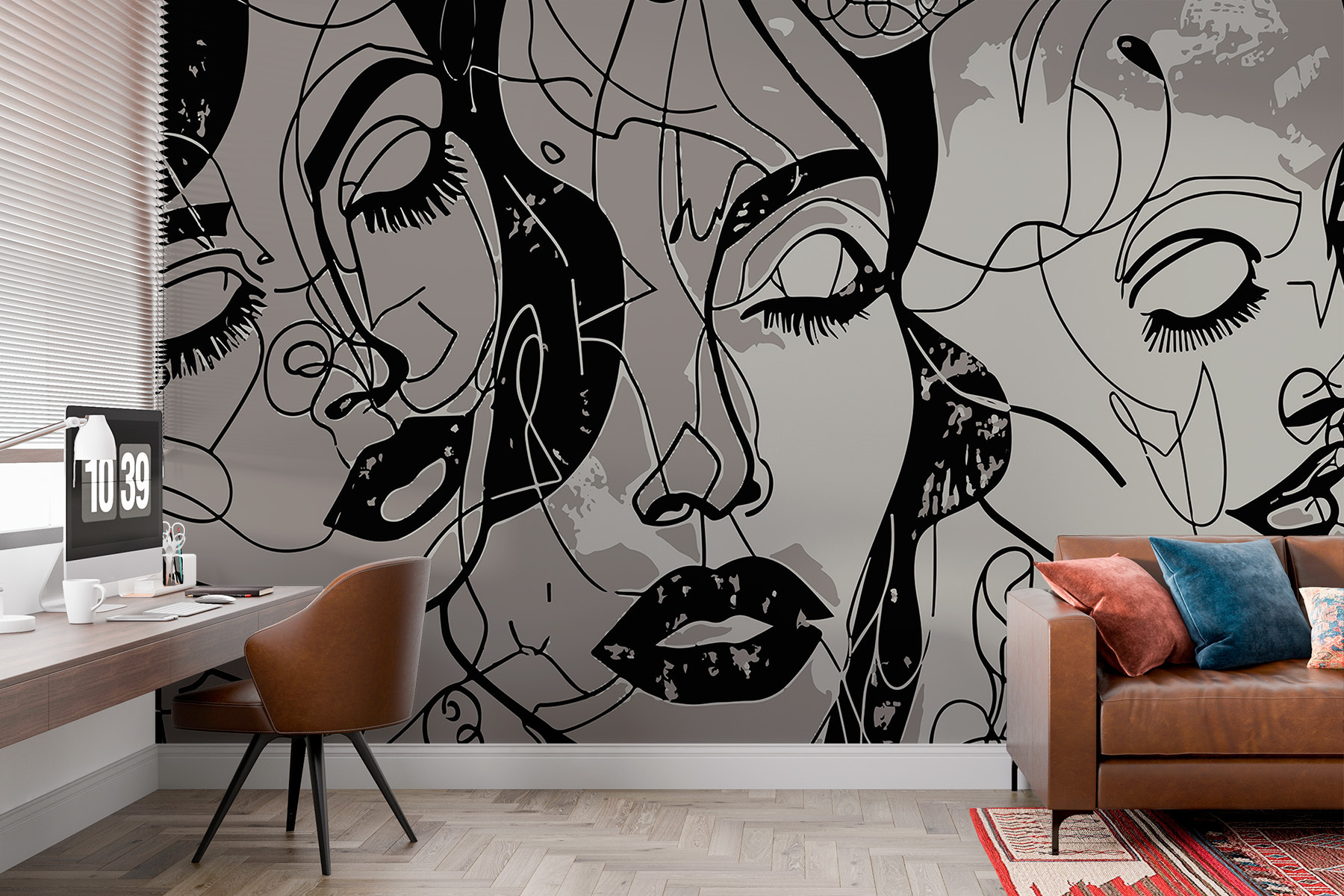 Introducing a stunning black and white mural that captures the essence of elegance and intrigue. This eye-catching piece features a woman’s face, beautifully detailed and wrapped in an abstract flow of lines and shapes. Imagine it brightening up a dull wall or serving as a stunning backdrop for those cozy dinner parties. The contrast and depth bring life to any space, inviting endless conversations. It’s like art that whispers stories—perfect for daydreaming or simply enjoying a quiet moment. Perfect for those who crave a touch of mystery and sophistication in their decor. Transform your walls and watch the compliments roll in!