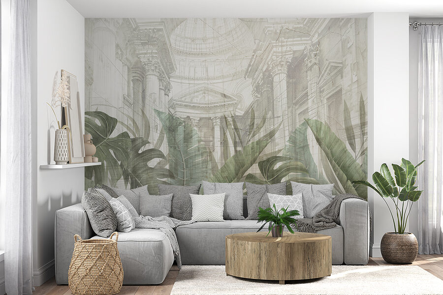 Transform your space with this striking wall mural featuring a majestic building intertwined with lush, oversized leaves. Imagine stepping into a serene oasis right in your living room, where the blend of elegance and nature breathes life into any wall. It’s like having a secret garden where you can escape everyday chaos. The soft colors create a calming vibe, making even the busiest days feel a bit slower. Perfect for those who love a touch of the outdoors, this mural invites a refreshing atmosphere—like a gentle breeze rustling through the leaves. Add a little flair to your home and let your walls tell a story!