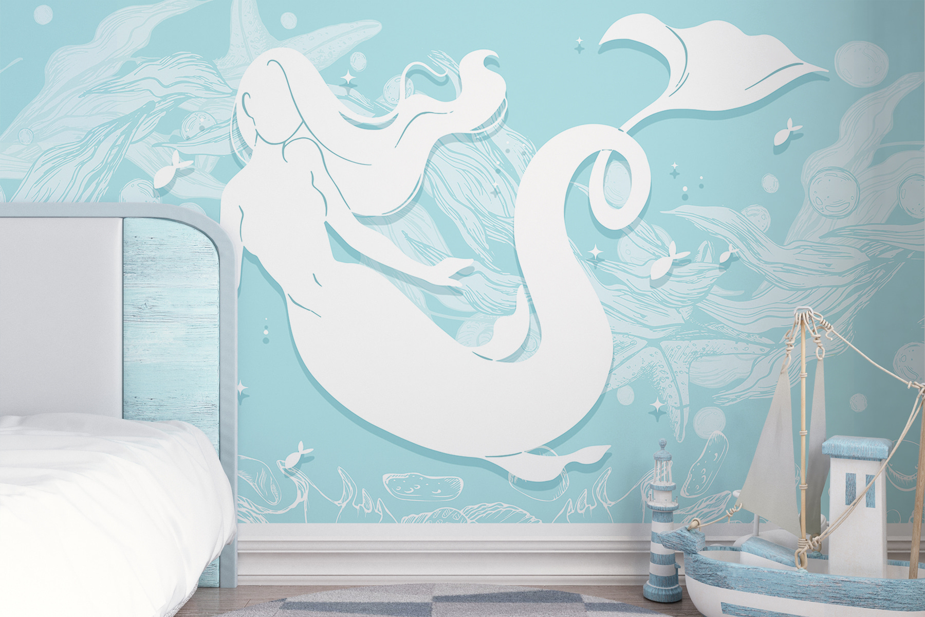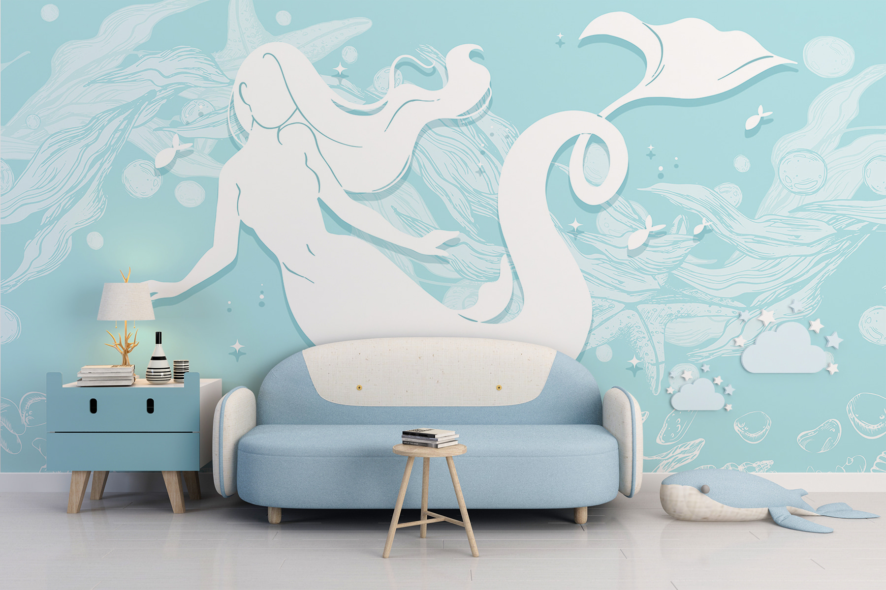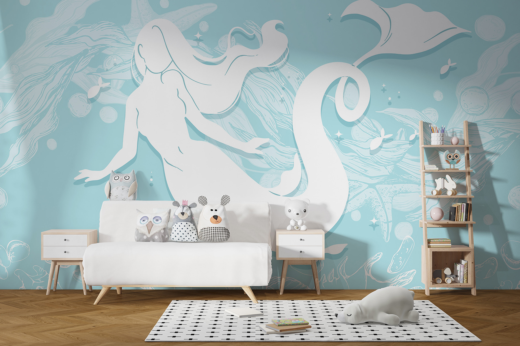 Dive into a world of whimsy with the “White Silhouette of a Mermaid” wall mural. This enchanting piece brings the magic of the ocean right to your space, with a serene mermaid gracefully swimming amidst playful sea creatures and gentle waves. Imagine walking into a room and instantly feeling the calm of a coastal retreat. The soft blue background is like a breath of fresh ocean air, perfect for brightening up any space. It’s almost like the mermaid is inviting you to daydream about sandy shores and salty breezes. Whether it’s a lounge, nursery, or creative nook, this mural sparks joy and inspiration. Who knows? It might even motivate you to take up seashell collecting!
