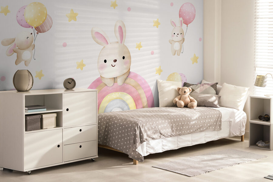 Imagine stepping into a room that feels like a cozy hug. This “Cartoon Bunny on a Rainbow” mural does just that! With its adorable bunnies floating with balloons and that sweet rainbow, it’s like a cheerful invitation to a whimsical world. Perfect for nurseries or playrooms, it brings smiles and giggles—not to mention inspired daydreams. Picture little ones pointing and laughing as they soak in the pastel palette. And let’s be honest, who wouldn’t want to relax in a space that feels like a playful escape? Bunnies, rainbows, and soft stars—what’s not to love?