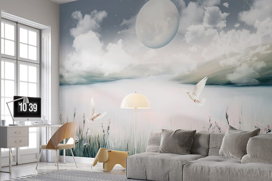 Transform your space into a serene escape with this enchanting mural, “Birds Flying Over a Lake.” Imagine the gentle sound of water lapping against the shore and the soft rustle of leaves as these graceful birds take flight. The dreamy colors and calm atmosphere make it feel like a peaceful retreat right in your home. Perfect for a cozy living room or a calming bedroom, this wall art invites a sense of tranquility that can whisk you away on a quick daydream. It’s like having a slice of nature’s beauty at your fingertips—without the bug bites! Just picture curling up with a good book and getting lost in the soothing vibes. Oh, the bliss!