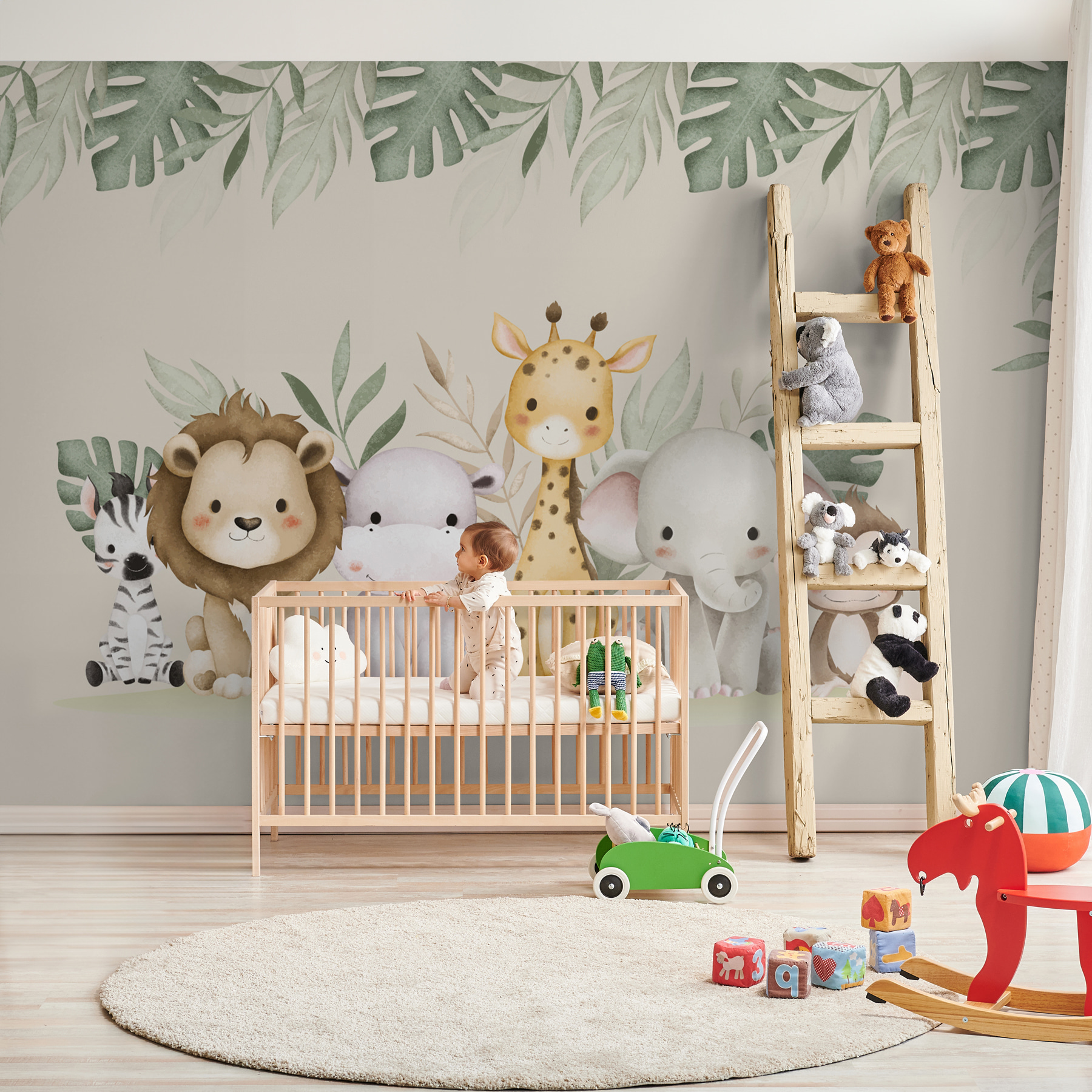 Imagine walking into a room where a charming crew of critters awaits you—a lion, a giraffe, and even a cheeky little monkey, all nestled among lush green leaves. This “Wall Murals Group of Animals Next to Leaves” mural is like a mini safari right at home. It’s perfect for brightening up a nursery or playroom, adding a whimsical touch that’ll make you smile every time you walk by. The soft colors and sweet expressions of these adorable animals can spark joy and imagination, reminding you to embrace the fun side of life. Picture little ones giggling and pointing, lost in the world of their new furry friends. Quite a conversation starter, right? Plus, who wouldn’t want a hippo staring lovingly at them? Add this delightful mural to your space, and let nature and wildlife bring a playful energy to everyday living!