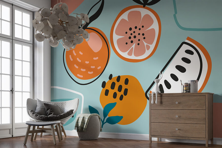 Brighten up any space with this delightful mural featuring a vibrant group of oranges alongside a refreshing glass of water. It’s like a summer picnic right in your living room! With playful colors and quirky shapes, this mural brings a cheerful ambiance that’s sure to spark joy. Imagine sipping a chilled drink while gazing at these juicy beauties, feeling like you’ve stepped into a sunny orchard. Perfect for kitchens or playful areas, this whimsical design invites warmth and a dash of fun. Get ready for compliments—it’s hard not to smile when surrounded by such zest!