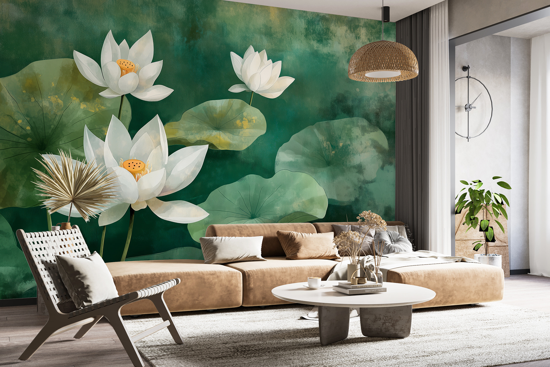 Transform any wall into a serene escape with this stunning mural of white flowers and lush leaves. Imagine waking up to the gentle presence of water lilies as they float gracefully in a dreamy green sea. It’s a bit like having a calming garden right in your home—no green thumb required! Perfect for cozy nooks or those moments when you just want to kick back and daydream. The soft watercolor vibe adds a touch of whimsy, making it feel like a secret paradise. Who knew home décor could transport you to such tranquil places? Just picture it—an effortless way to brighten a space and soothe the soul at the same time. It might even inspire some inner peace, or at least make lounging around feel like a mini-vacation!