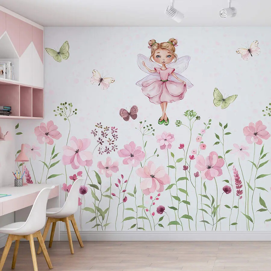 Transform any room into a whimsical escape with this enchanting wall mural featuring a fairy in a pink dress, twirling among delicate flowers. It’s like inviting a sprinkle of magic into your space—perfect for a nursery or a cozy reading nook. The soft watercolor style adds a gentle touch, making it easy on the eyes while still being a delightful focal point. Imagine cuddling up with a book, feeling like you’ve stepped into a fairytale. Those fluttering butterflies? Just the cherry on top—talk about a dreamy vibe!