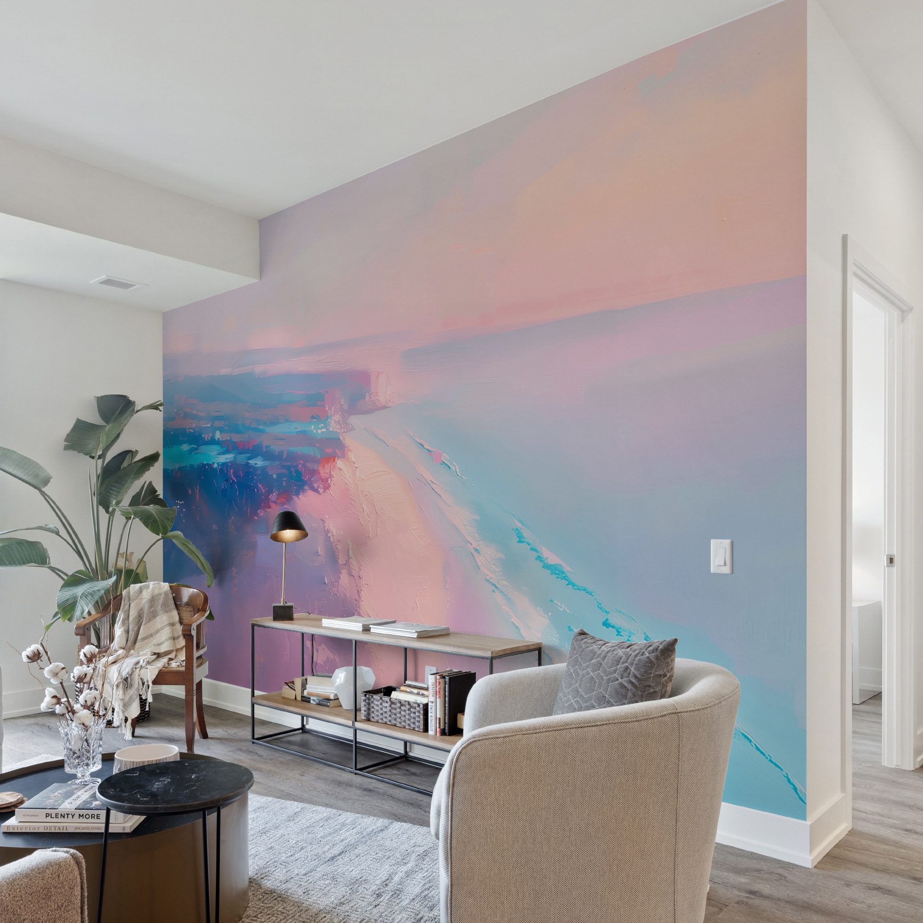 Transform your space with this stunning beach mural, where a dreamy pink and blue sky collides with serene waves. Imagine sipping a cool drink, feeling the warm breeze, and watching the sun dip below the horizon—all from the comfort of your living room. This mural doesn’t just add color; it brings a whole vibe. Perfect for anyone craving an escape, it whispers relaxation and wanderlust. Picture friends gathering, smiles broadening as they bask in this tranquil paradise. Who knew a wall could feel like a mini vacation? Dive into your decor adventure with this unique gem!