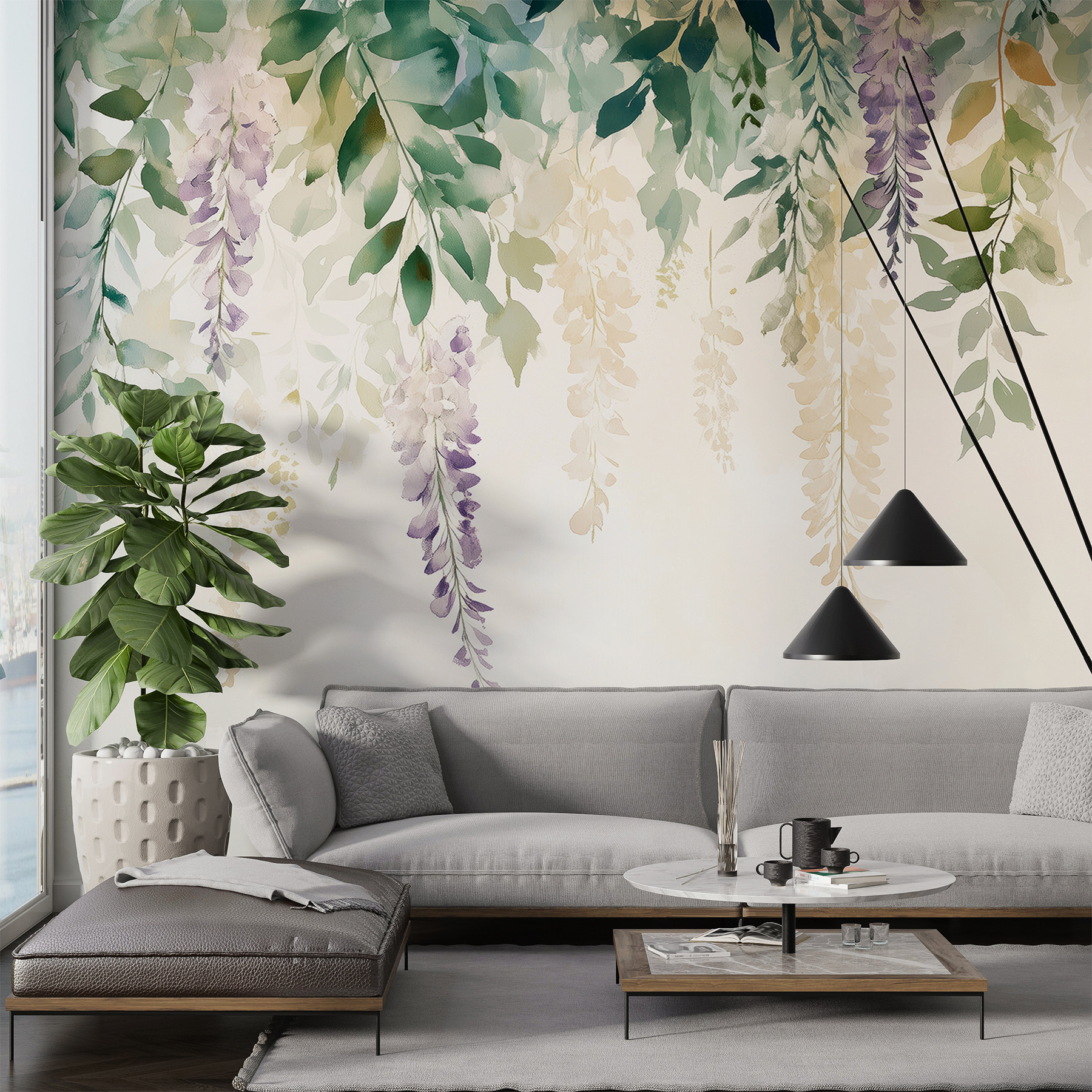 Transform your space with this enchanting wall mural showcasing a delightful dance of flowers and leaves. Imagine walking into a room where delicate blossoms sway above, casting a calming vibe that almost feels like a gentle breeze. Shades of green and hints of lavender create a serene, nature-inspired backdrop, perfect for those cozy mornings with a cup of coffee or a relaxing evening unwind. It’s like having a secret garden right on your wall! Guests will swoon—maybe even ask if you have a green thumb. This mural brings tranquility and a touch of whimsy to any space. It’s not just decor; it’s an experience. So, why not invite nature indoors?