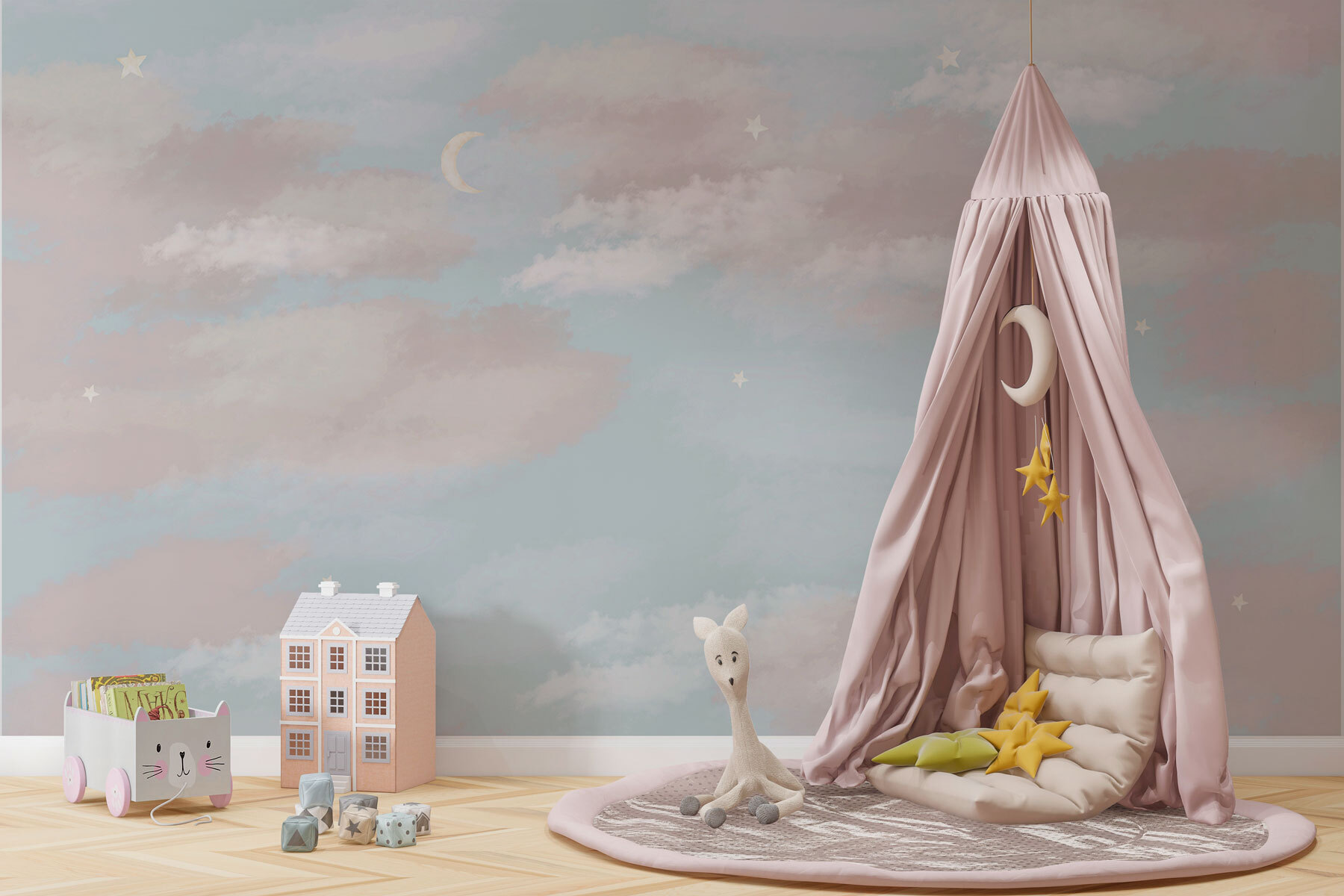 Imagine stepping into a room that feels like a gentle breeze in spring—this mural brings that vibe right to your walls! “Blue Sky with Clouds and a Crescent Moon” isn’t just a decoration; it’s like having a dreamy sky day every day. Soft hues of blue mingle with whispery clouds and a serene crescent moon, inviting calmness into any space. Perfect for a cozy reading nook or a playful kids’ room, it sprouts imagination like a wildflower in spring. Just think: friends popping by, and their eyes lighting up at this charming mural. It’s like nature’s art, right at home. Bring in some pillows, a cup of tea, and let the day drift away!