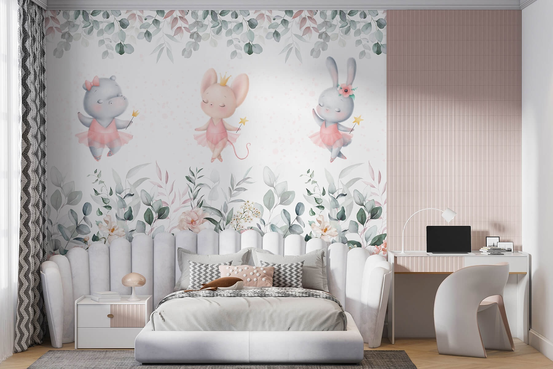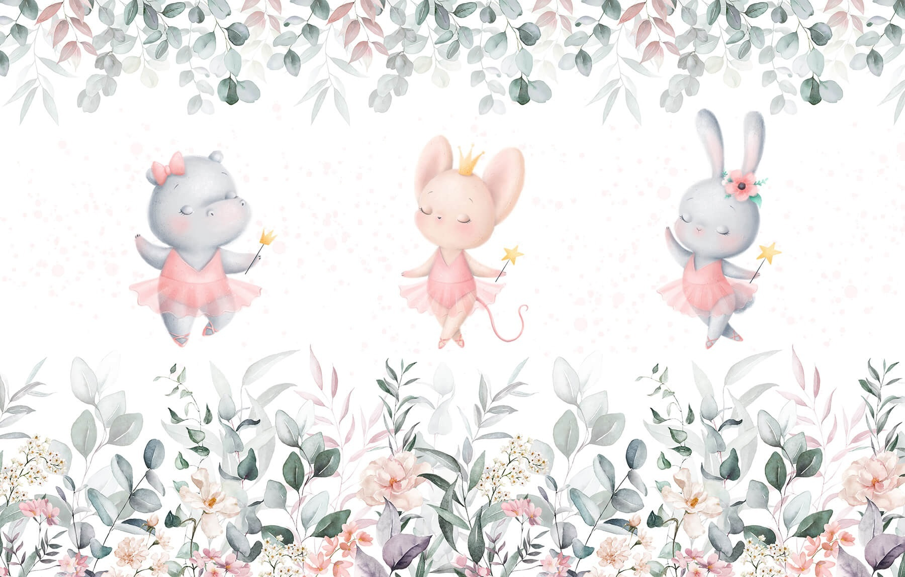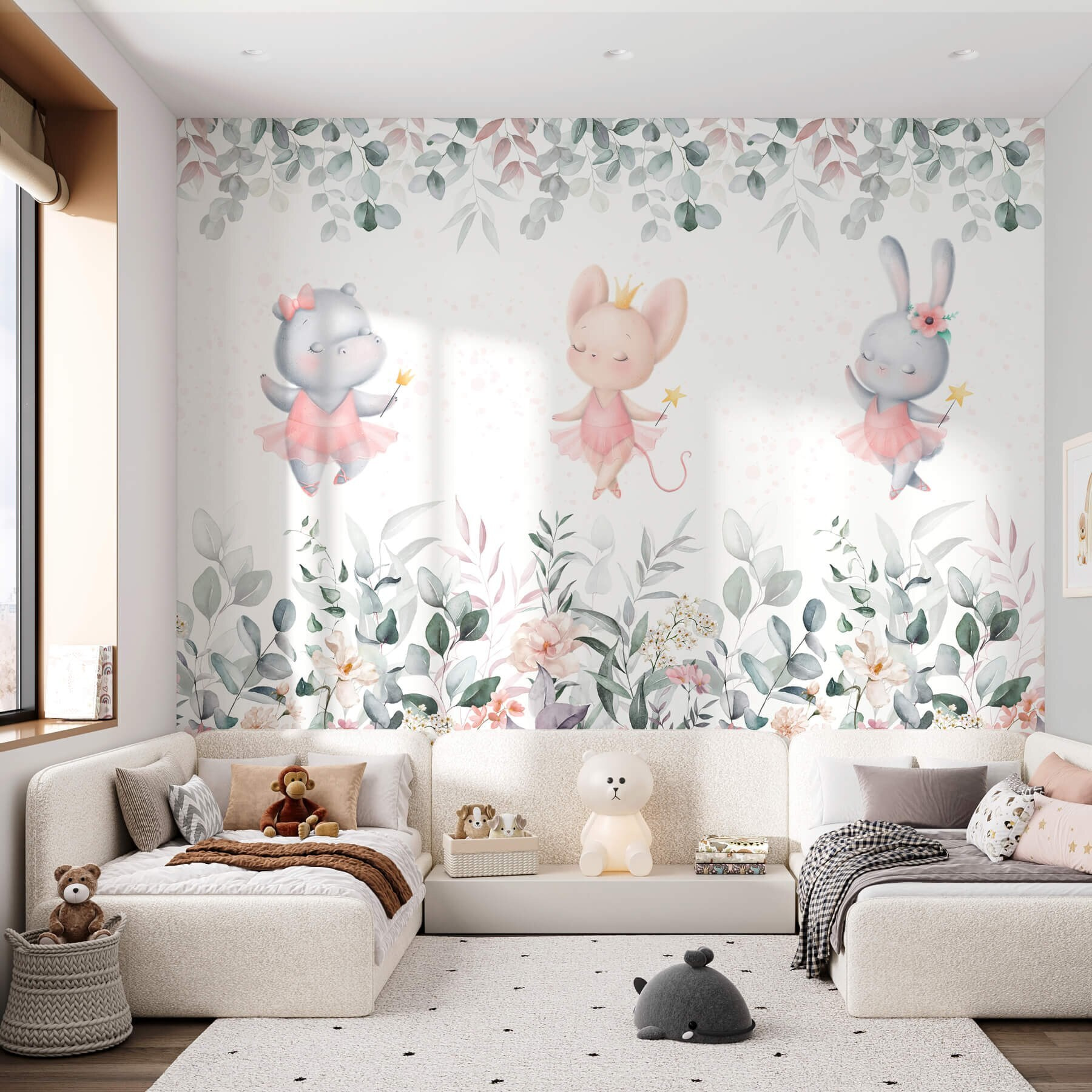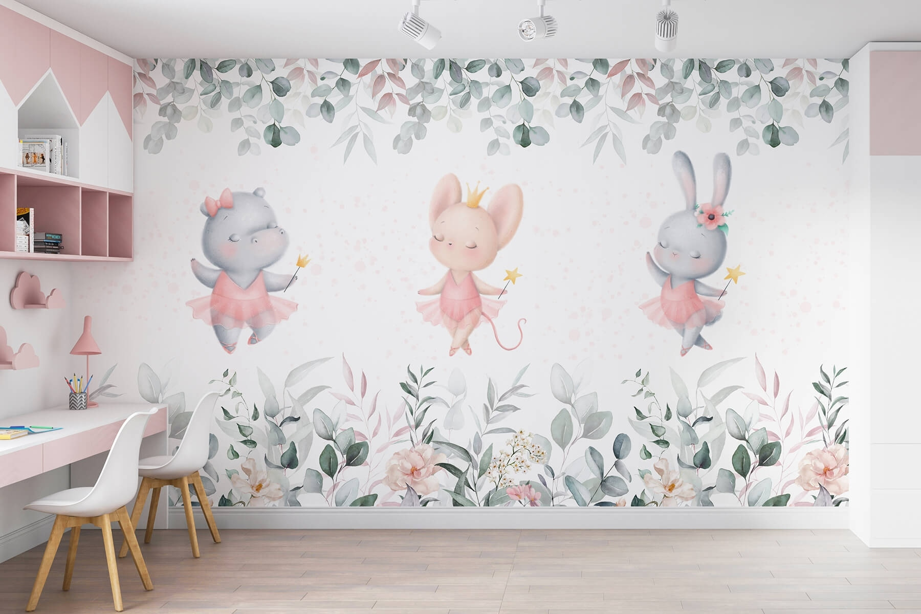 Transform any space with this delightful mural featuring a charming crew of animals dressed in pink tutu skirts. Imagine a playful hippo, a graceful mouse, and a sweet bunny twirling among soft blooms. It’s like a backstage pass to a whimsical dance party in nature! The gentle pastel colors invite warmth and joy, making it perfect for a child’s room or even a cozy reading nook. Friends and family might just stop in their tracks, chuckling at the cuteness. This mural doesn’t just decorate; it tells a story of fun, friendship, and a splash of enchantment. It’s a little world waiting to inspire smiles and sweet dreams!