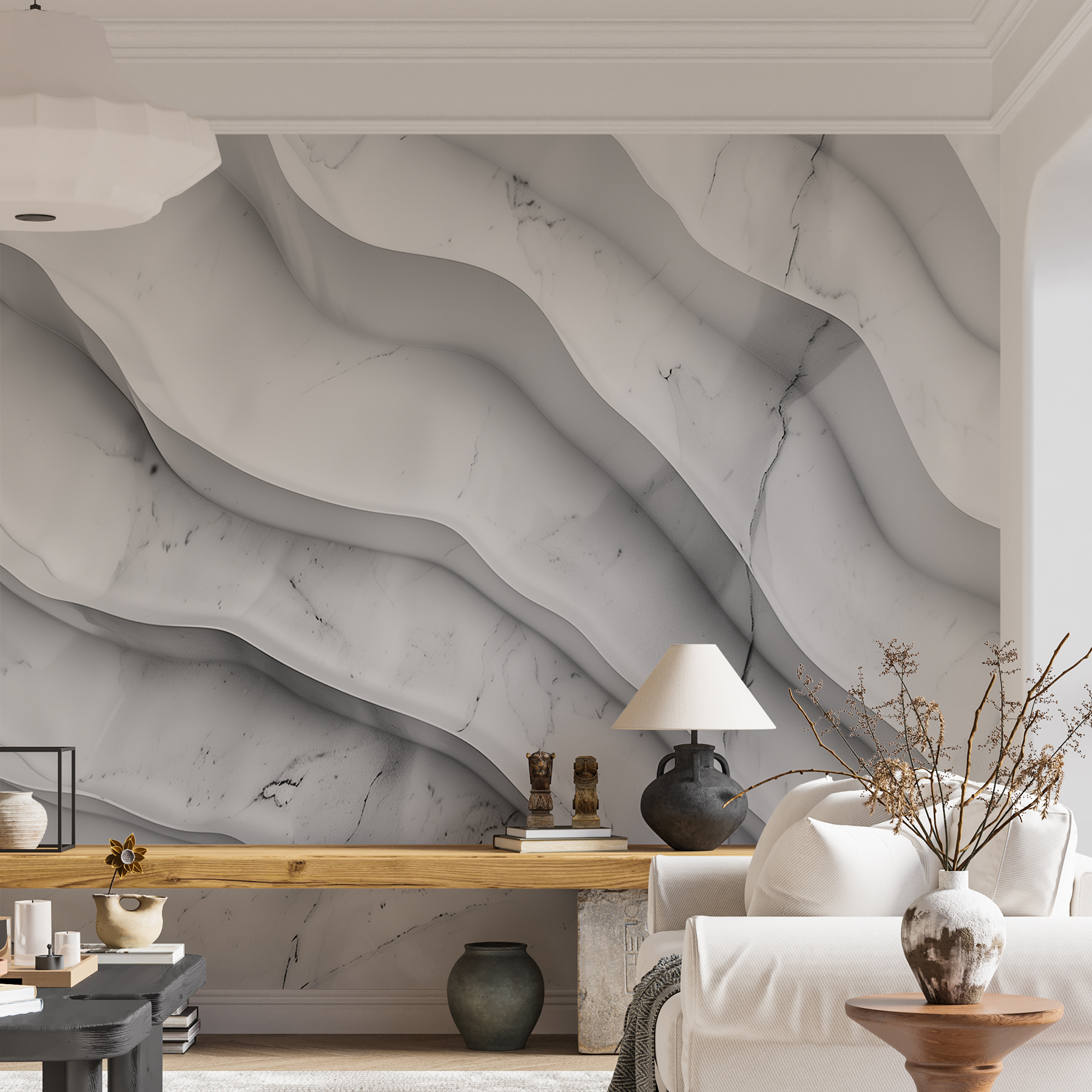 Imagine stepping into a space that feels as fluid as a gentle wave—this “Wall Murals White Marble Surface with Wavy Lines” does just that. Its soft, undulating patterns bring a touch of nature’s elegance right into your home. Picture it in a cozy nook or perhaps as a dramatic focal point in a living room. You might even feel like you’ve stepped into a serene spa, ready to unwind. The subtle marbling adds a hint of sophistication, without breaking the bank. It’s like bringing a little piece of luxury into your everyday life—who wouldn’t want that? Plus, it pairs effortlessly with plants or art. Perfect for those who appreciate unique decor without the stuffy vibe.