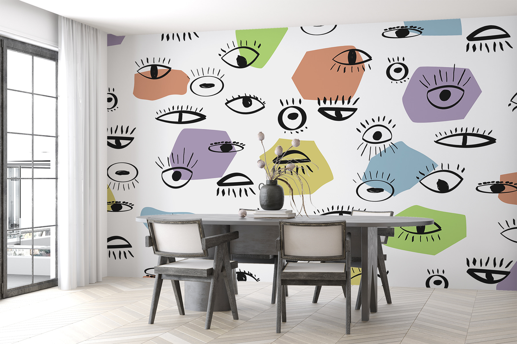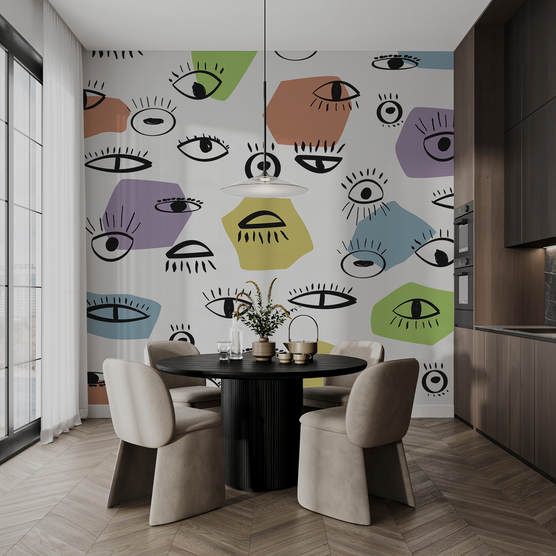 This mural, with its playful arrangement of colorful eyes, might just be the most eye-catching addition to any room. Imagine walking into a space where every corner feels alive, like those peepers are watching over your cozy moments. The vibrant hues—think greens, yellows, and purples—bring a sense of joy and whimsy, perfect for a kid’s room or a creative workspace. It’s quirky, but not too out there, making it just the right mix of fun and stylish. Who wouldn’t want to invite their walls to join the conversation? Your guests might just get lost in a gaze—or three! Perfect for adding a splash of personality without the commitment of a full-blown renovation.
