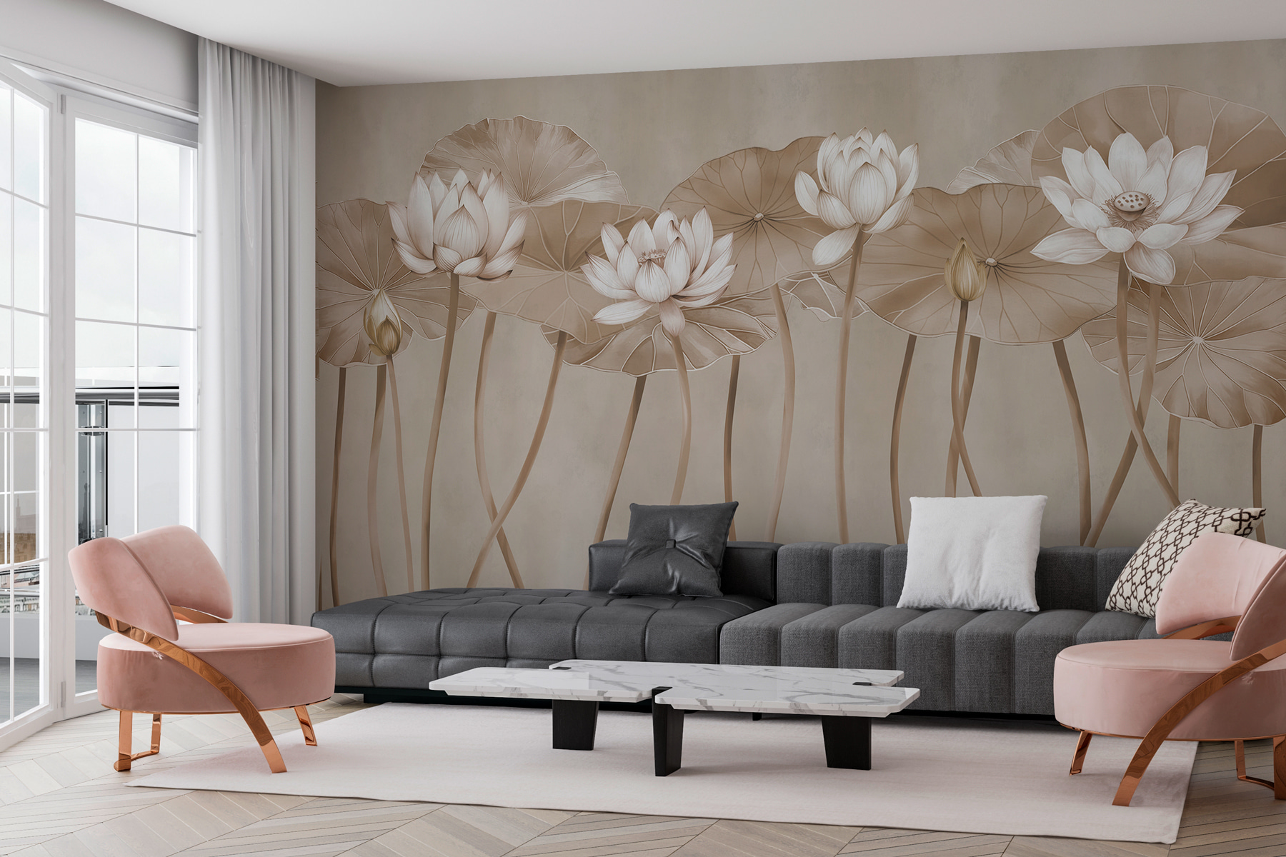 Transform any room into a serene oasis with the Ethereal Lotus in Monochrome Hues mural. Imagine walking into your space and being greeted by these delicate lotus blossoms, standing tall on their graceful stems. It’s like nature whispered its calm, inviting you to slow down and breathe. This mural isn’t just decor; it’s a mood booster, making every gathering feel a little more special. Picture a cozy evening with friends, laughter echoing off these subtle hues, or a quiet moment with a book as the sunlight dances across the petals. Who knew a wall could feel so alive? Perfect for flower lovers and anyone wanting a touch of tranquility without the maintenance. It’s a win-win!