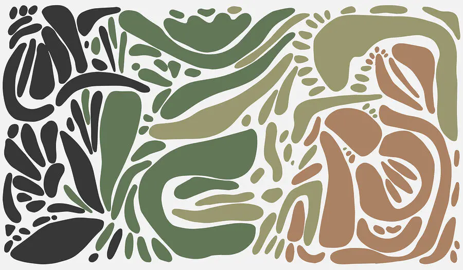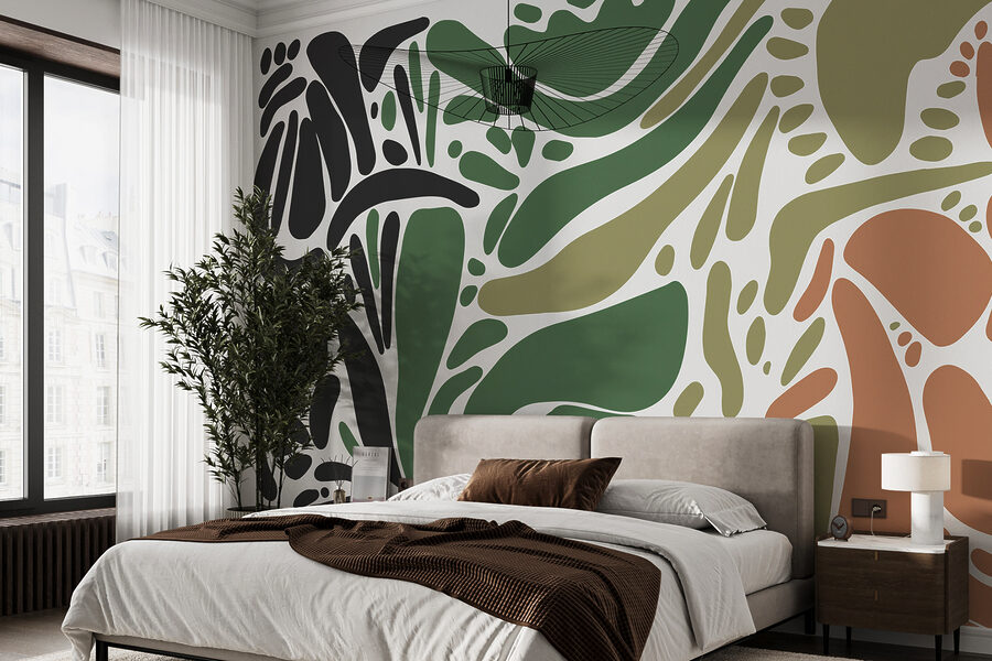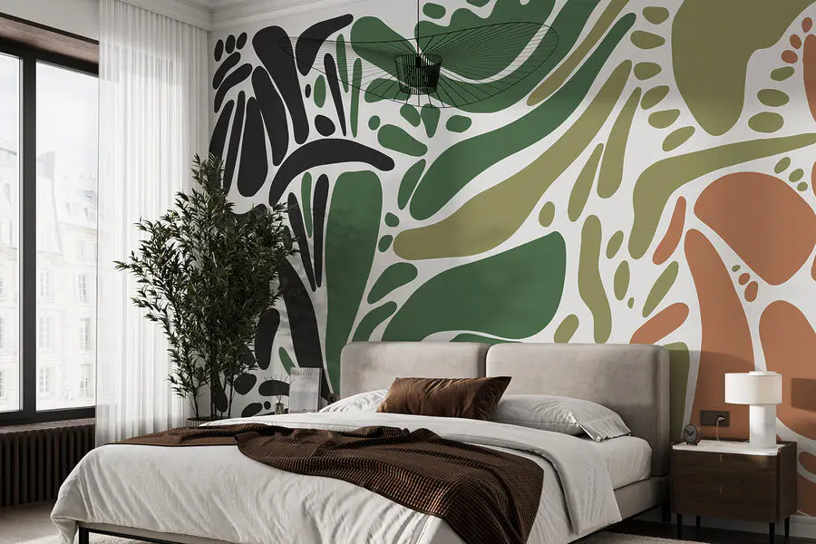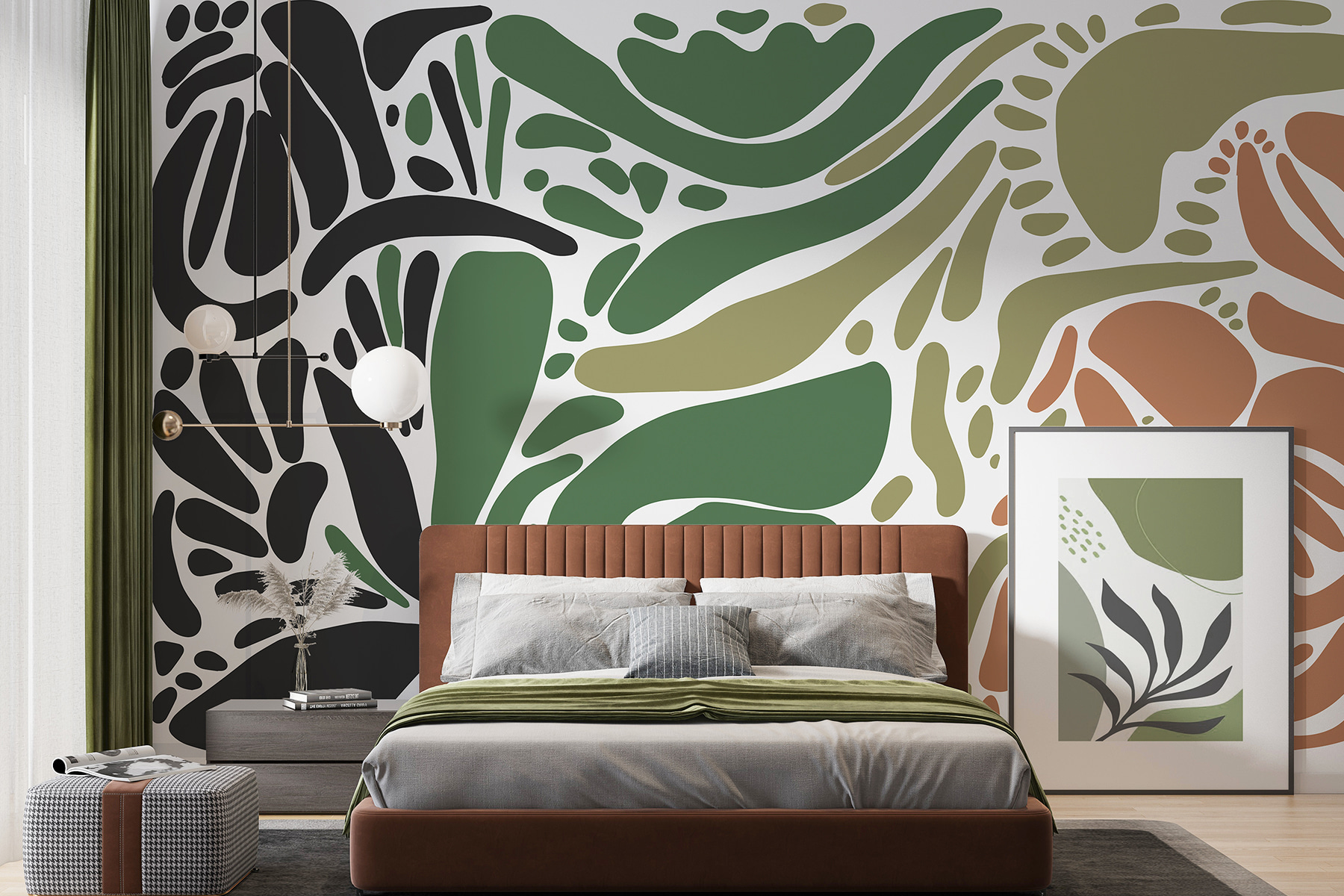 Brighten up any room with this stunning mural, featuring a lively mix of shapes and colors that dance across your walls. Imagine coming home to a burst of natural vibes that feels like a walk through an abstract garden. The earthy greens and playful browns invite a sense of calm, while the bold black outlines add just the right amount of drama. It’s perfect for creating a cozy reading nook or a vibrant dining space where conversations flow as easily as the colors. Honestly, it’s like bringing a piece of art right into your everyday life—no gallery ticket required! Just picture it: guests marveling at the scene, while you sip your coffee, feeling like an interior design guru. What a mood!